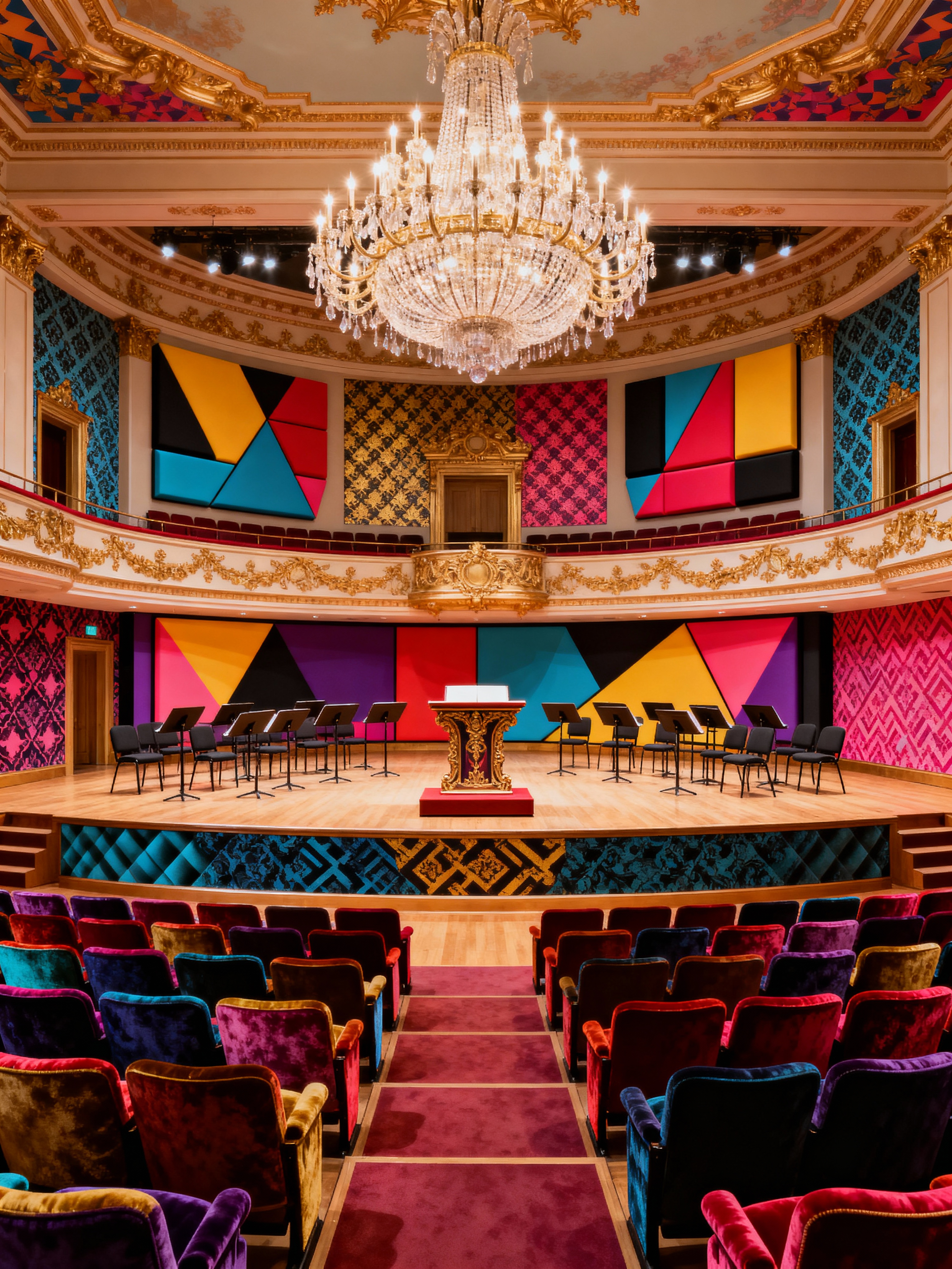 concert hall with maximalist style with chandelier and stage and conductor podium and music stands and orchestra pit and orchestra seats and elegant decor and acoustic panels. . with eye-catching and vibrant and playful and more is more philosophy and bold patterns and over-the-top aesthetic and bold design and bold colors