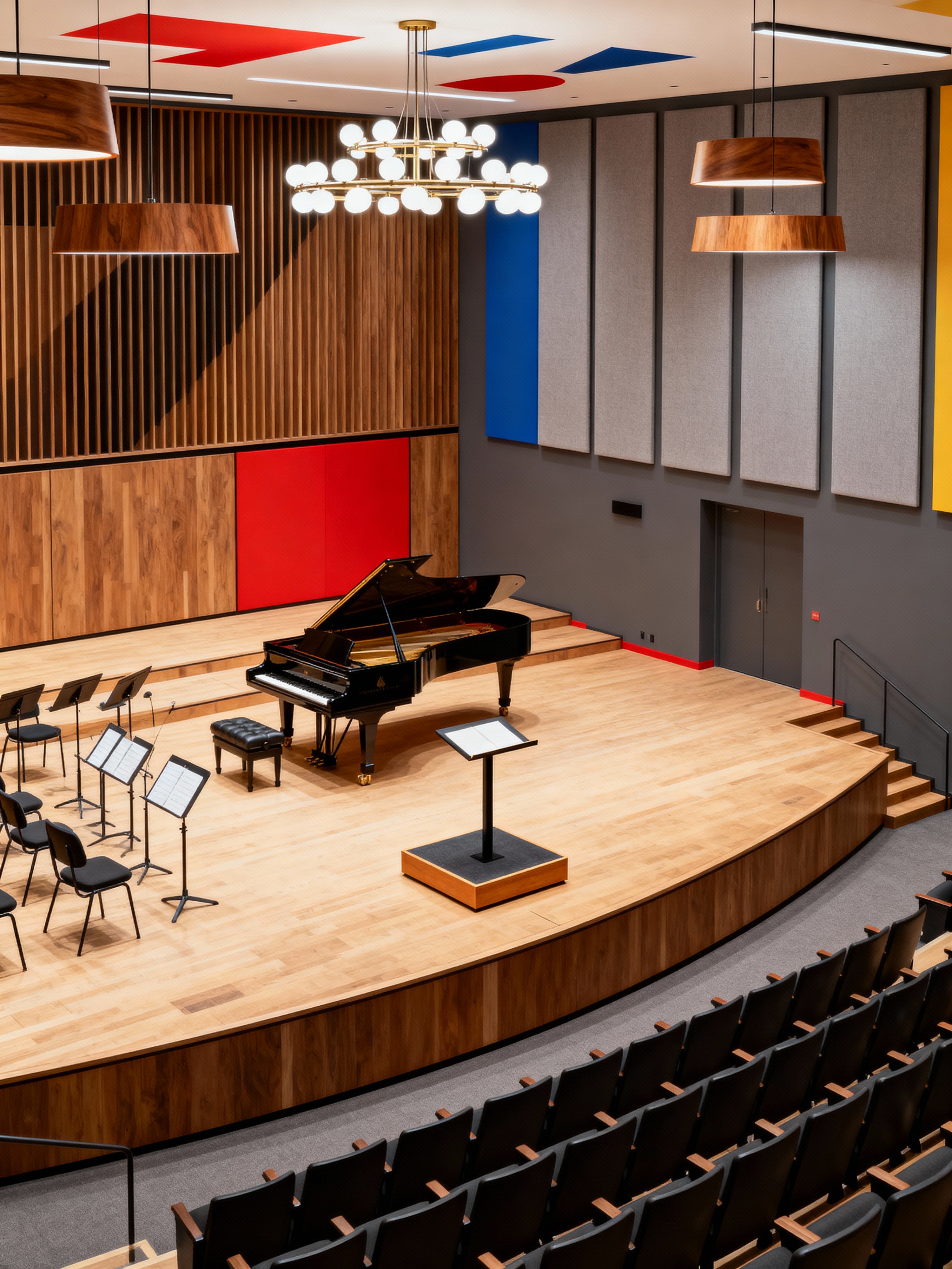 concert hall with midcentury modern style with chandelier and elegant decor and music stands and stage and grand piano and conductor podium and orchestra pit and acoustic panels. . with natural and manmade materials and vibrant colors and muted tones and function over form and minimalist and wood pendant light mid century modern chandelier and clean lines and graphic shapes