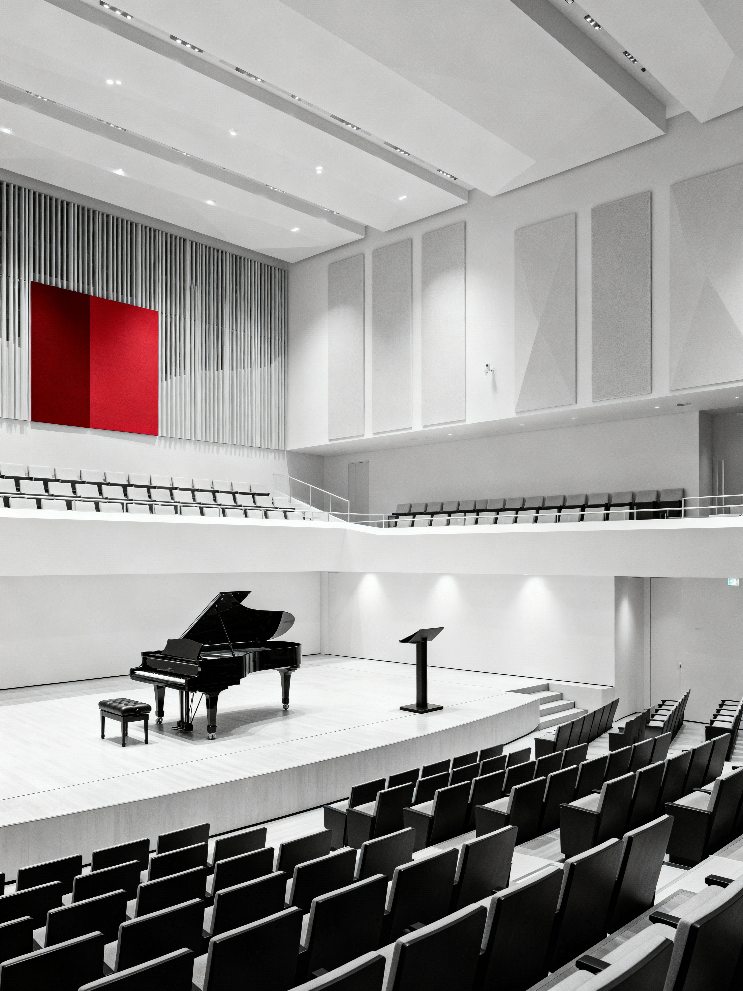 concert hall with minimalist style with elegant decor and grand piano and conductor podium and balcony seating and acoustic panels and orchestra seats and stage and orchestra pit. . with a monochromatic palette with colour used as an accent and clean lines and an open floor plan and lots of light and functional furniture and focus on the shape, colour and texture of just a few of essential elements and a monochromatic palette with colour used as an accent
