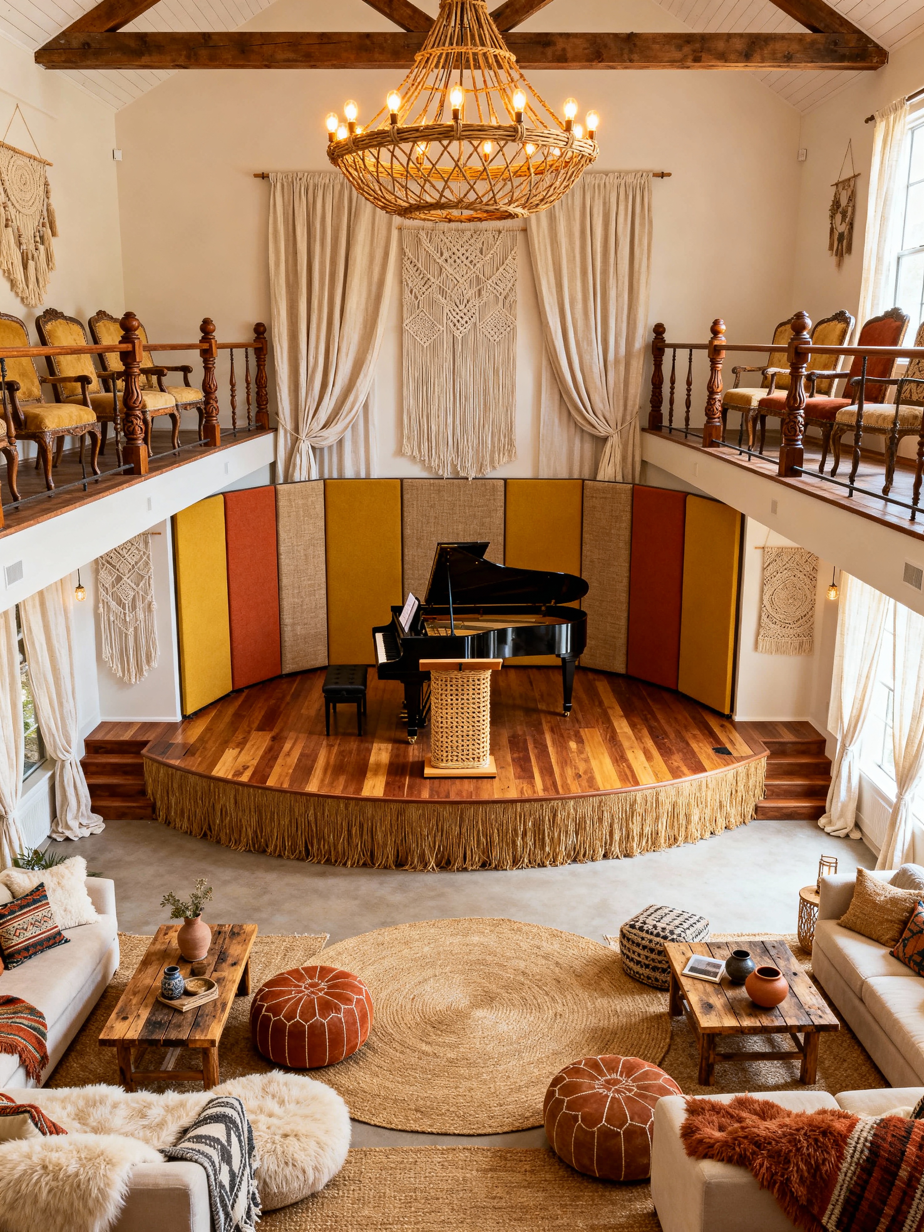 concert hall with modern boho style with orchestra pit and acoustic panels and conductor podium and stage and balcony seating and elegant decor and grand piano and chandelier. . with warm colors and eclectic style and airy space and cotton textiles and wood decor and woven textures and vintage furniture and cozy feel