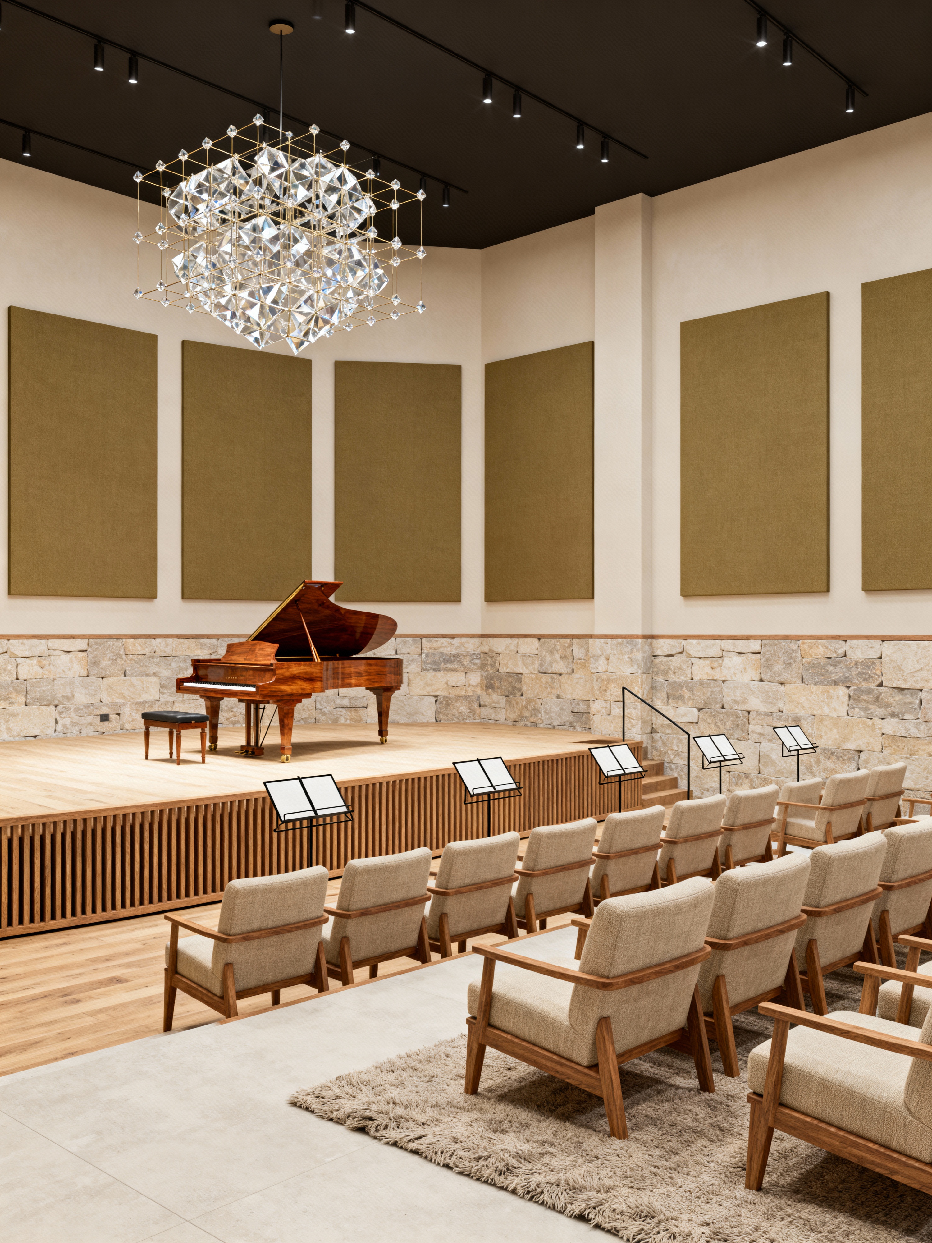 concert hall with modern style with orchestra seats and chandelier and grand piano and acoustic panels and orchestra pit and stage and elegant decor and music stands. . with natural materials and elements and neutral walls and textures and open and natural lighting and practicality and functionality and simple, clean lines and simplistic furniture and natural materials and elements