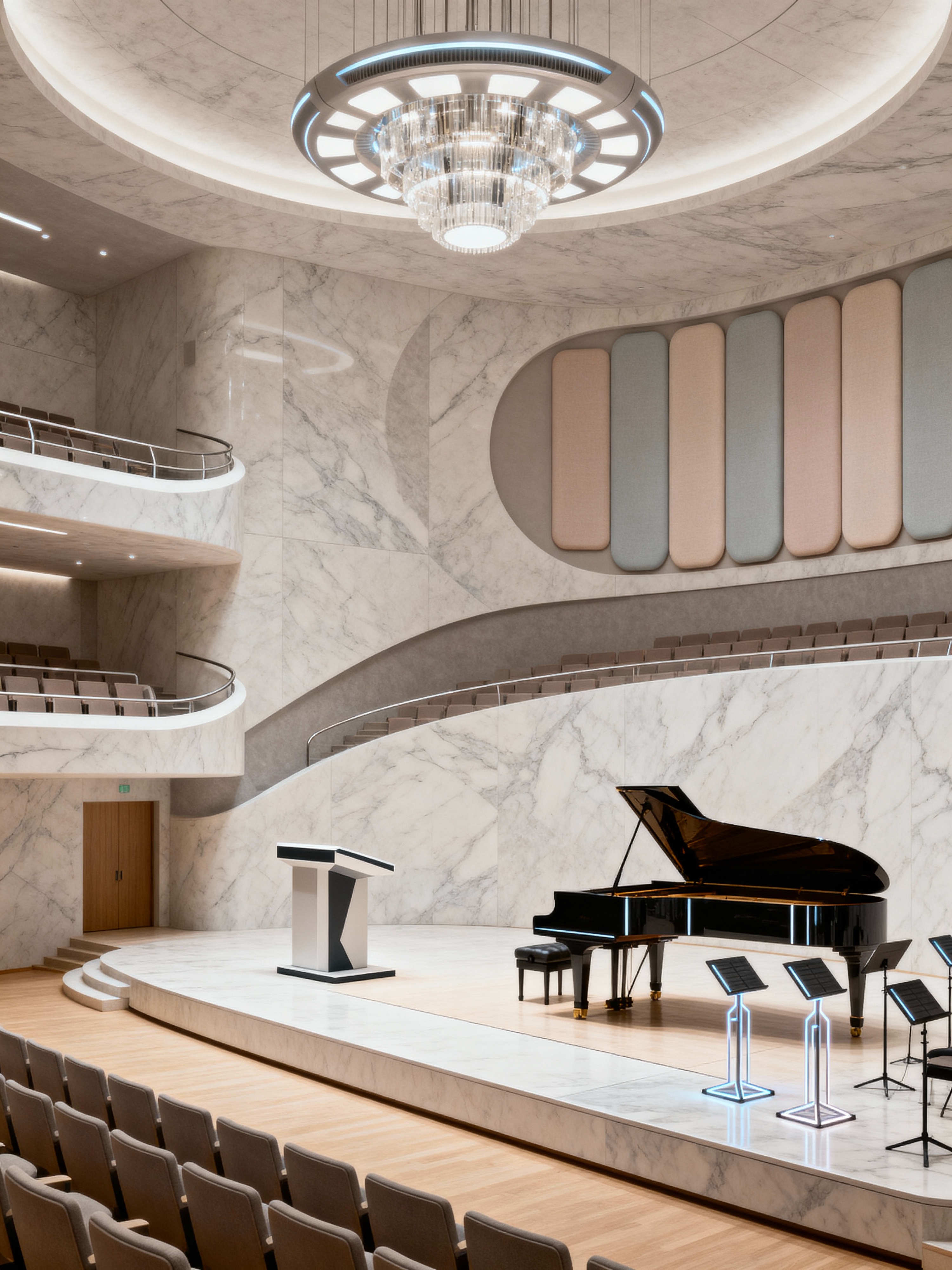concert hall with retro futuristic style with chandelier and acoustic panels and balcony seating and conductor podium and grand piano and stage and music stands and orchestra seats. . with light colors and futurism minimalist interior and futuristic interior and minimalist clean lines and vintage futurism and smooth marble and circular shapes and strong geometric walls