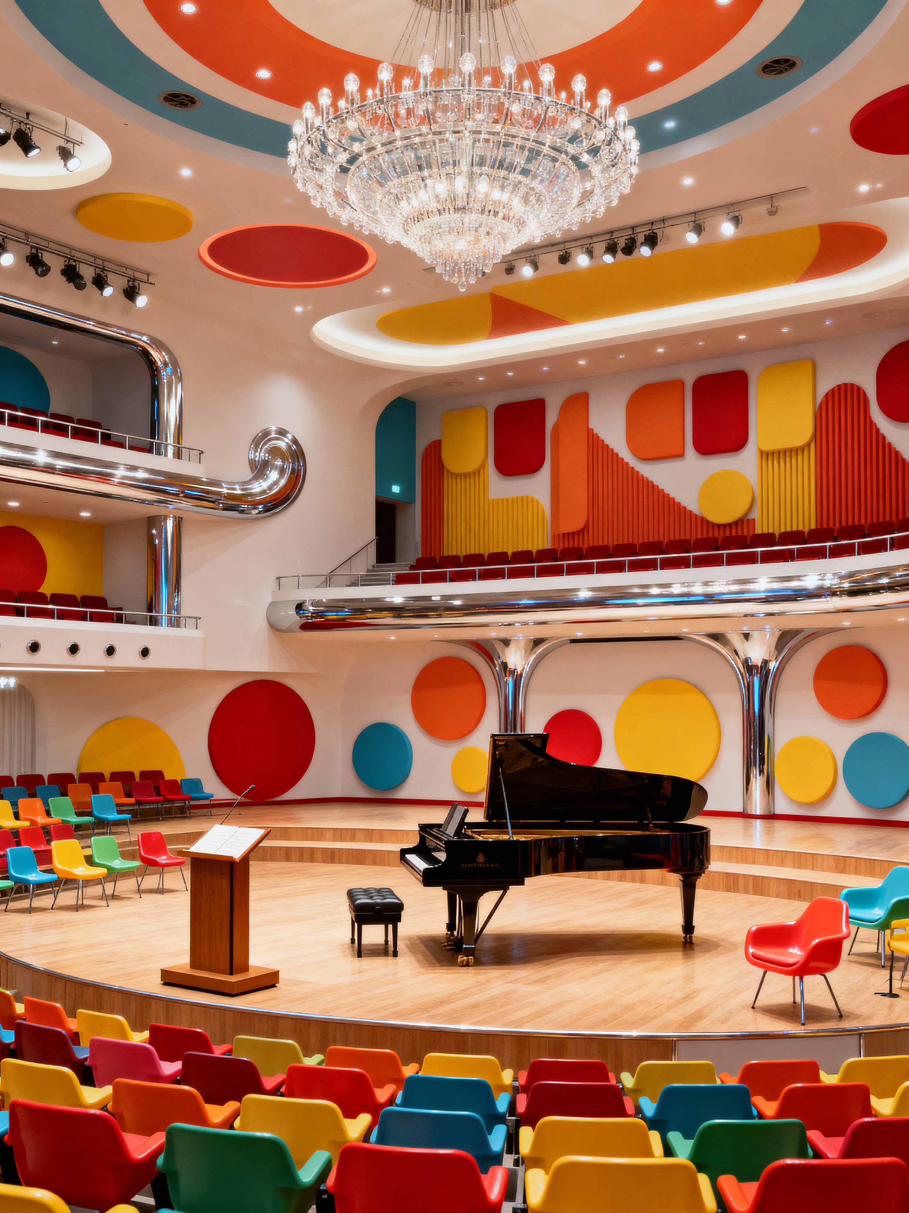 concert hall with retro style with conductor podium and chandelier and orchestra pit and stage and elegant decor and balcony seating and grand piano and acoustic panels. . with bright colors and bold patterns and space age and vintage revival and mod style and plastic furniture and funky decor and chrome accents