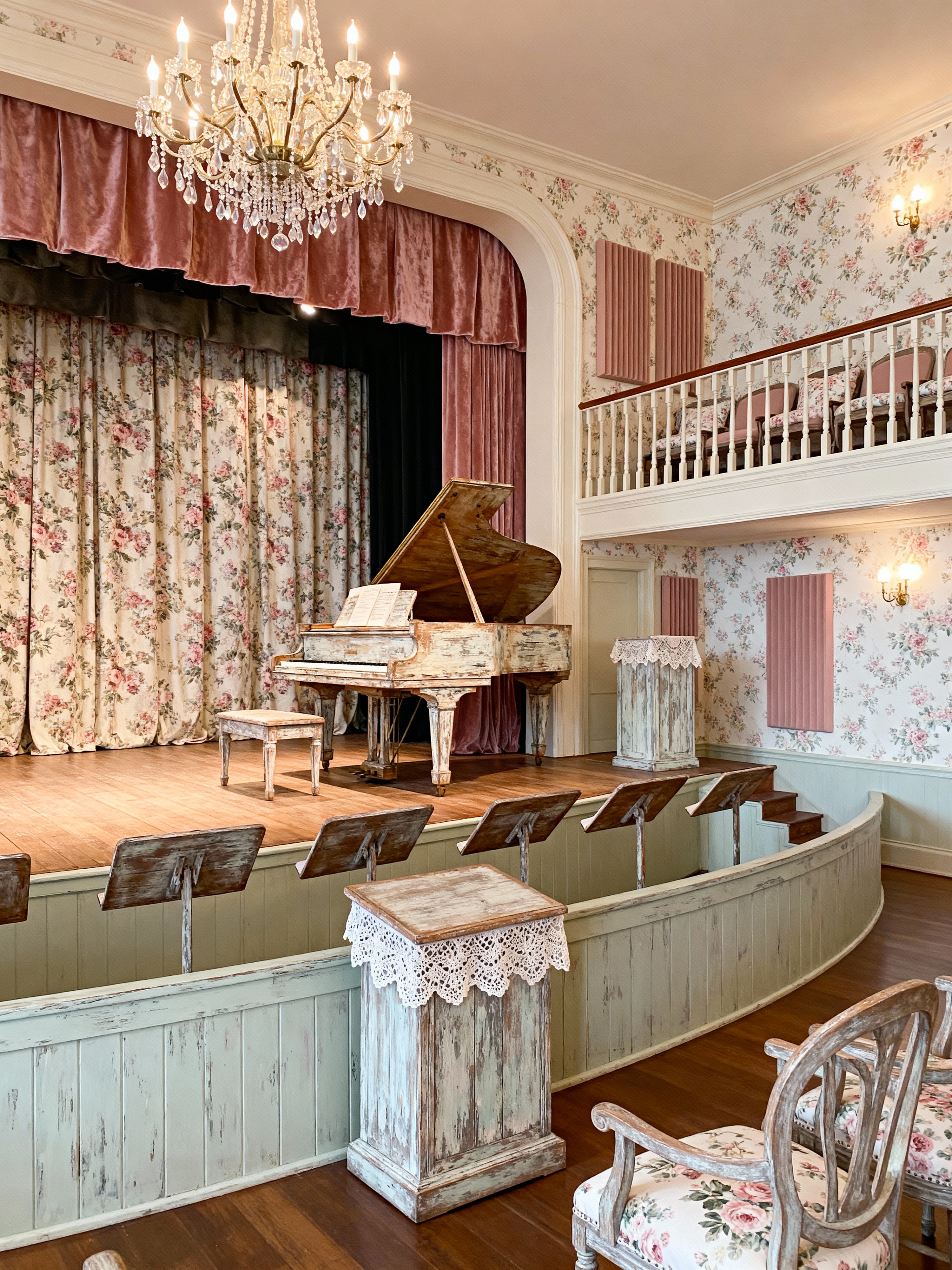 concert hall with shabby chic style with grand piano and stage and orchestra pit and music stands and chandelier and conductor podium and acoustic panels and balcony seating. . with cottage feel and distressed furniture and floral patterns and romantic style and weathered finishes and soft textures and delicate details and antique lace