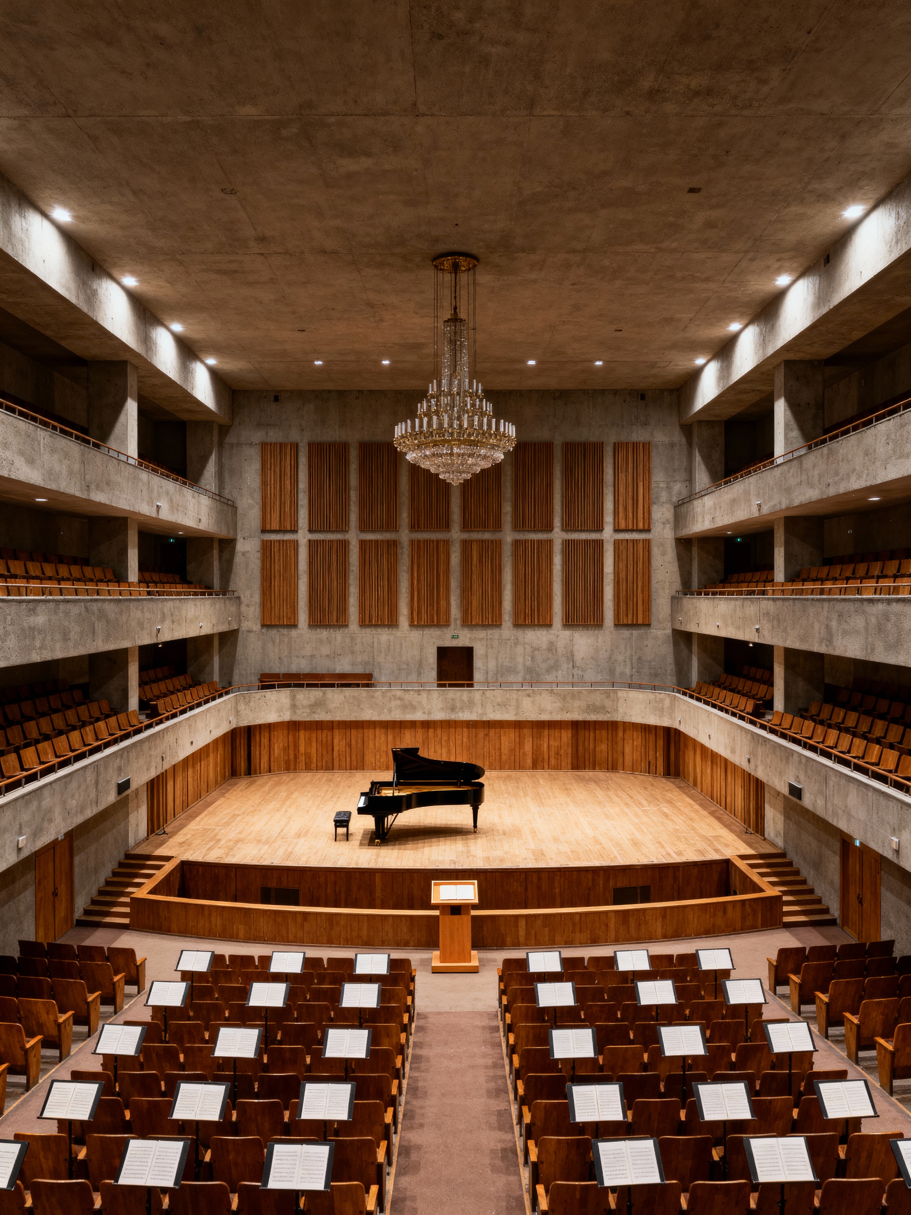 concert hall with soviet style with grand piano and music stands and balcony seating and acoustic panels and orchestra seats and conductor podium and orchestra pit and chandelier. . with institutional look and socialist realism and functional furniture and austere aesthetic and communist design and eastern bloc and monumental scale and soviet-era architecture
