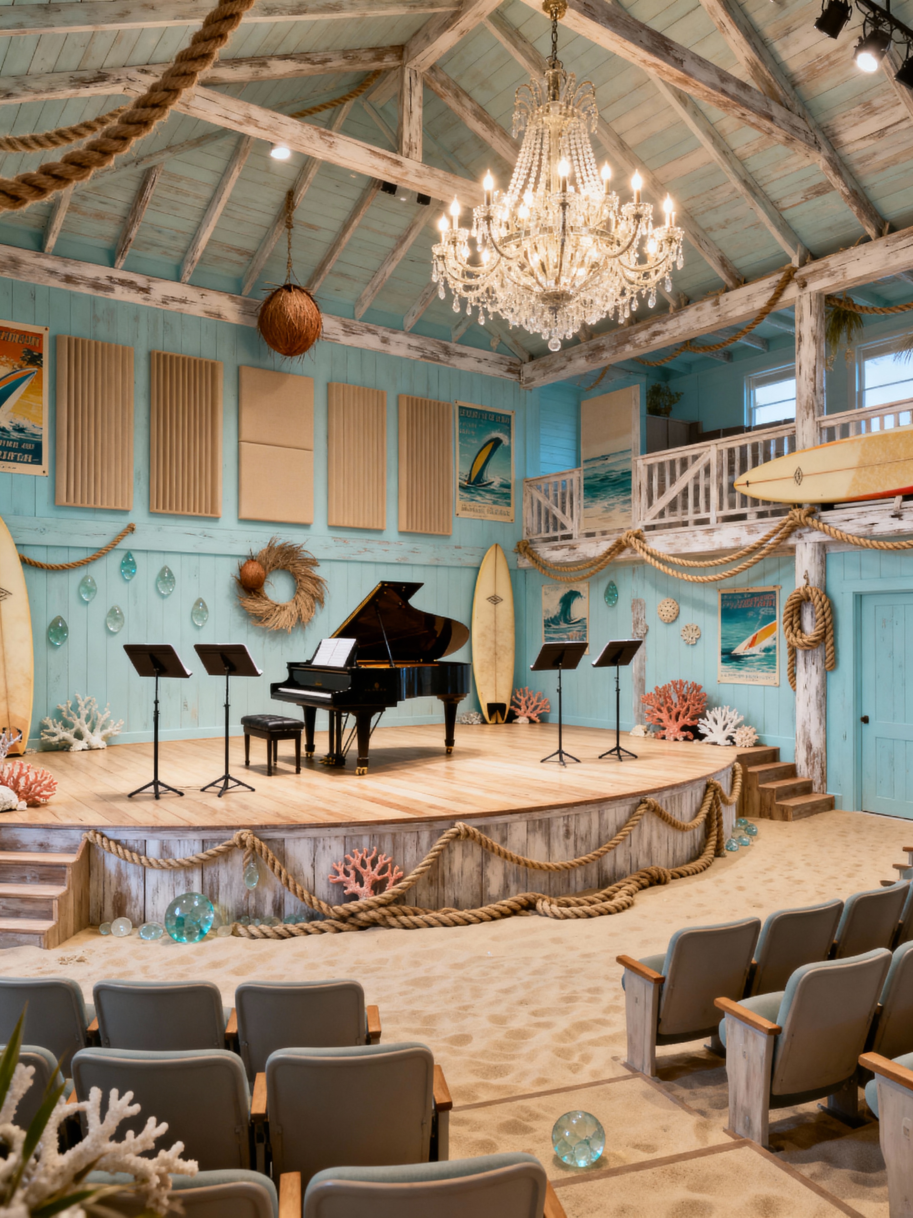 concert hall with surf shack style with music stands and chandelier and grand piano and stage and orchestra pit and orchestra seats and elegant decor and acoustic panels. . with coconut decor and nautical rope and sun-bleached wood and vintage surf posters and sea glass and rope details and surfboard decor and coral accents