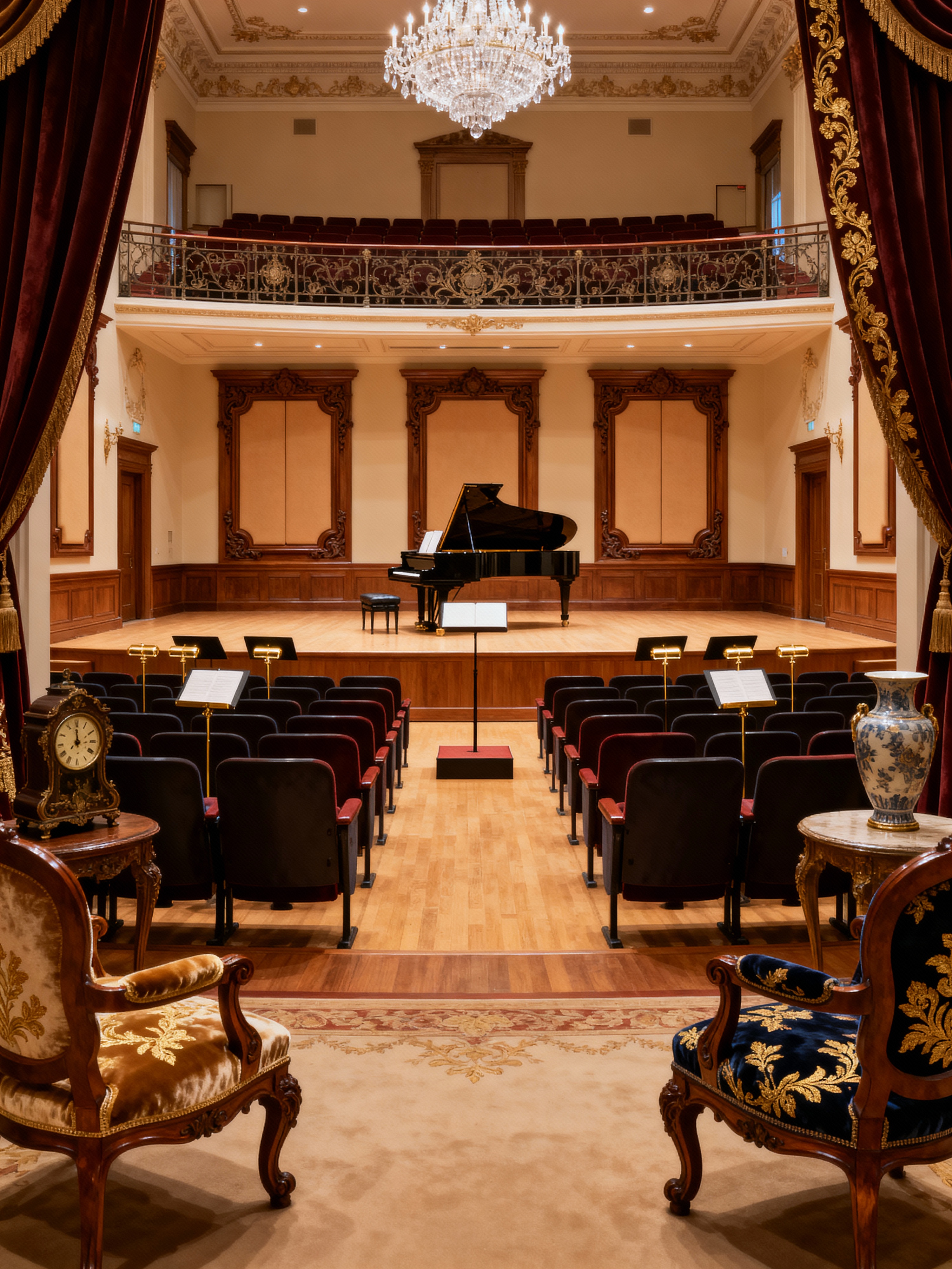 concert hall with traditional style with conductor podium and orchestra seats and balcony seating and stage and grand piano and music stands and chandelier and acoustic panels. . with symmetrical layout and formal furniture and ornate details and warm colors and luxurious textiles and refined atmosphere and rich fabrics and antique pieces