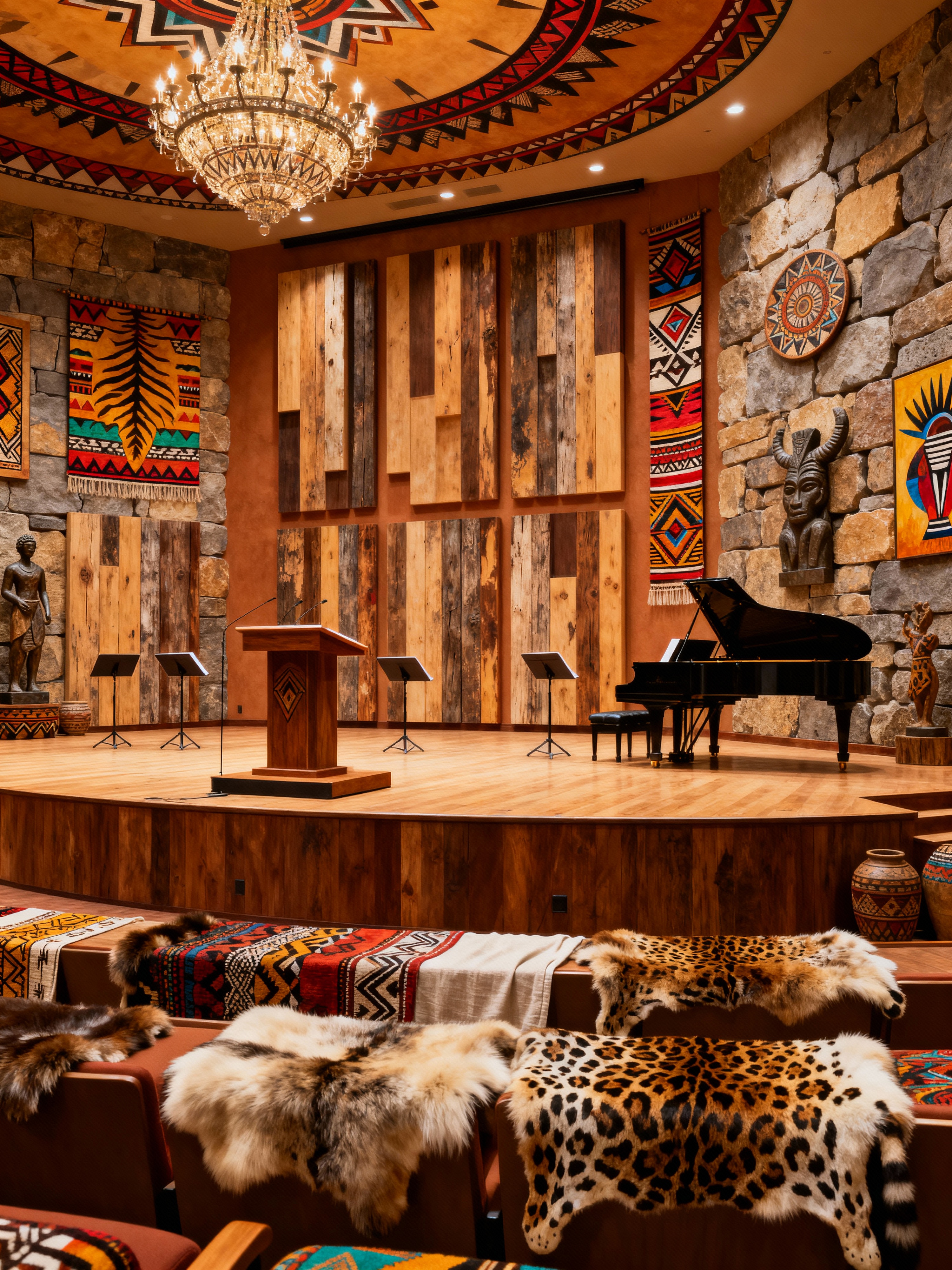 concert hall with tribal style with orchestra pit and chandelier and stage and acoustic panels and conductor podium and elegant decor and music stands and grand piano. . with animal furslinen and tribal patterns and tribal revival and animal prints and exuberant splashes of colour and planks of stone and smooth worn timbers and sculptures and artworks