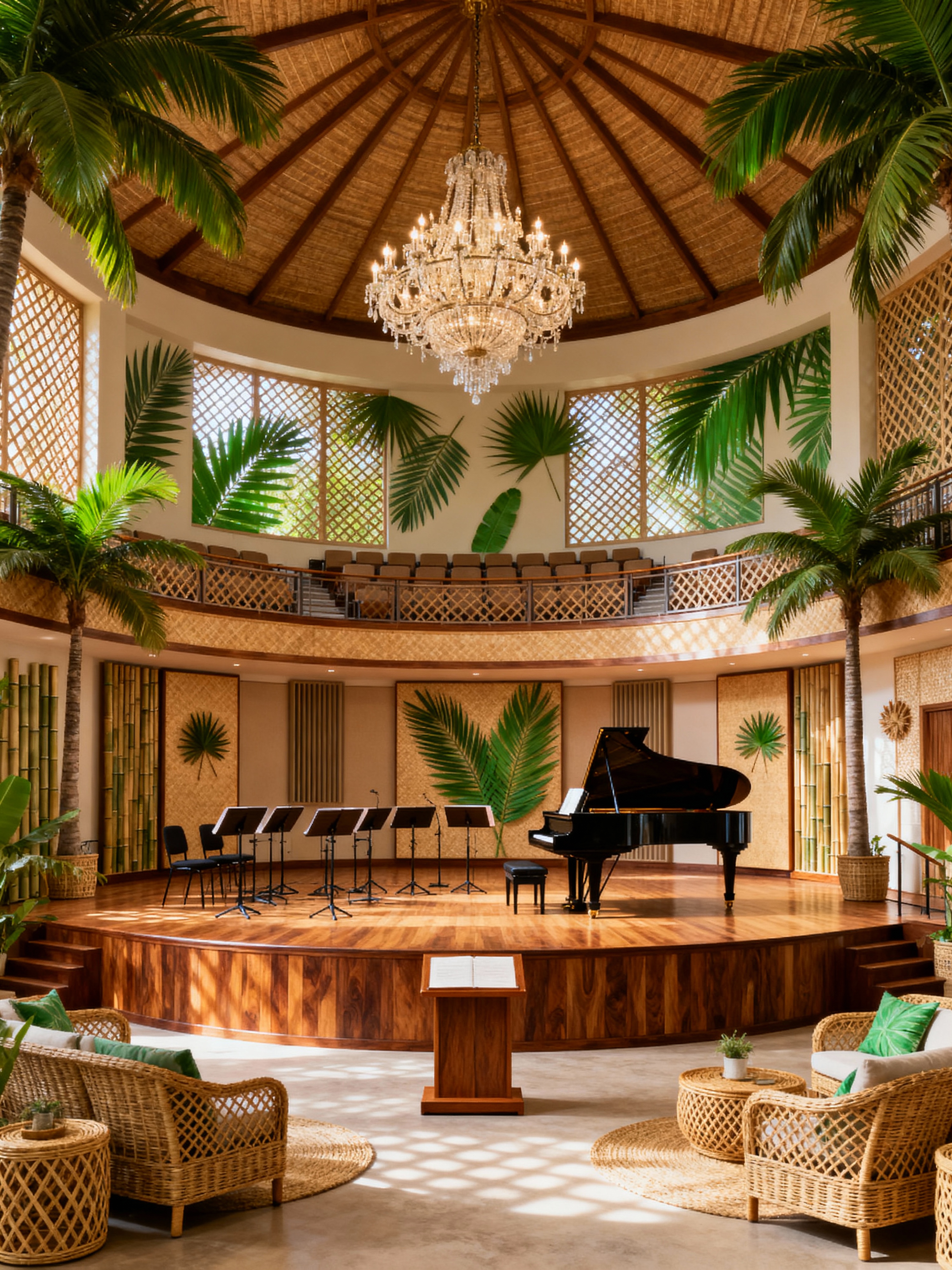 concert hall with tropical style with orchestra pit and elegant decor and music stands and acoustic panels and chandelier and grand piano and balcony seating and conductor podium. . with lattice prints and wicker and palm trees and teak and cane motifs and bamboo and palm leaves and rattan