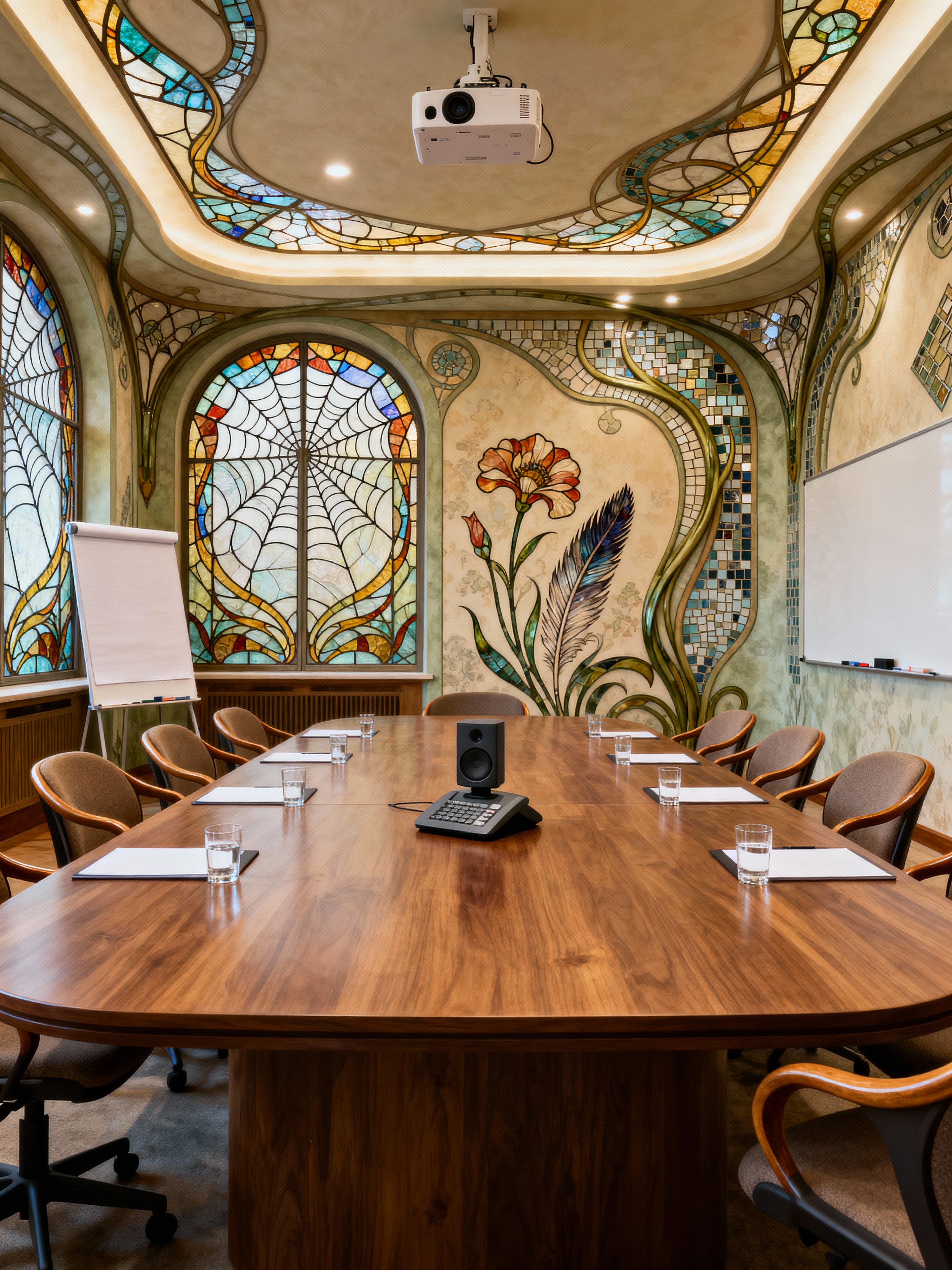 conference hall with art nouveau style with flipchart and projector and whiteboard and conference table and notepads and water glasses and speaker phone and office chairs. . with asymmetrical shapes and stained glass and soft, rounded lines and wallpaper pattners of spider webs and wallpaper patterns of stylized flowers and mosaics and wallpaper patterns of feathers and curving, plant-like embellishments