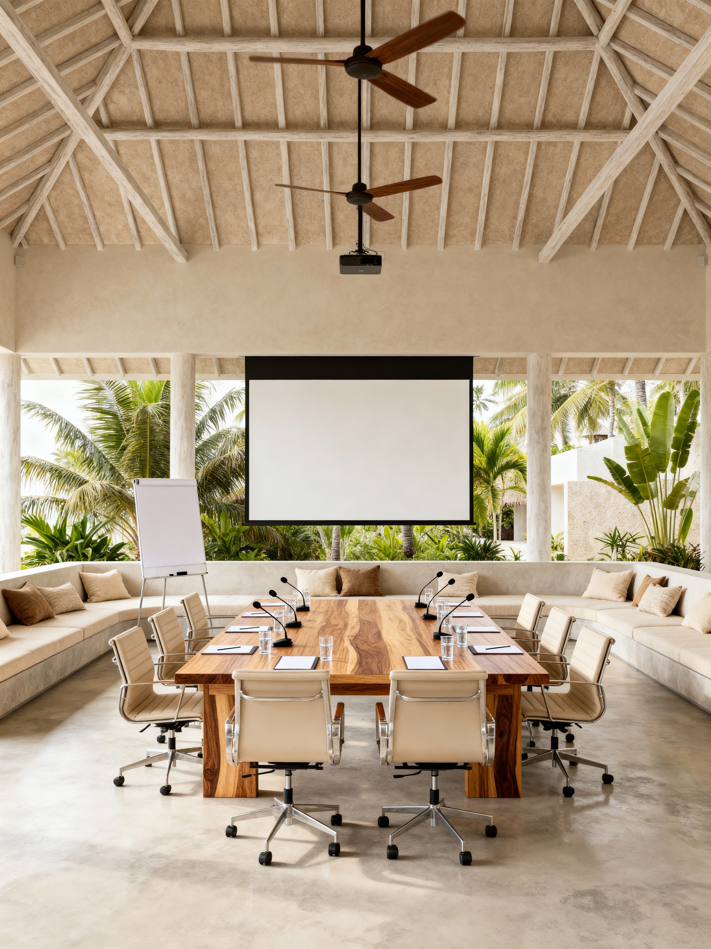 conference hall with bali style with microphones and conference table and projection screen and water glasses and office chairs and notepads and flipchart and whiteboard. . with microcement floors and open high ceilings with fans and light wood furniture (teak, oak) and modern boho chic and linen or cotton fabrics and calm, minimal, tropical atmosphere and neutral color palette and conversation pit with pillows