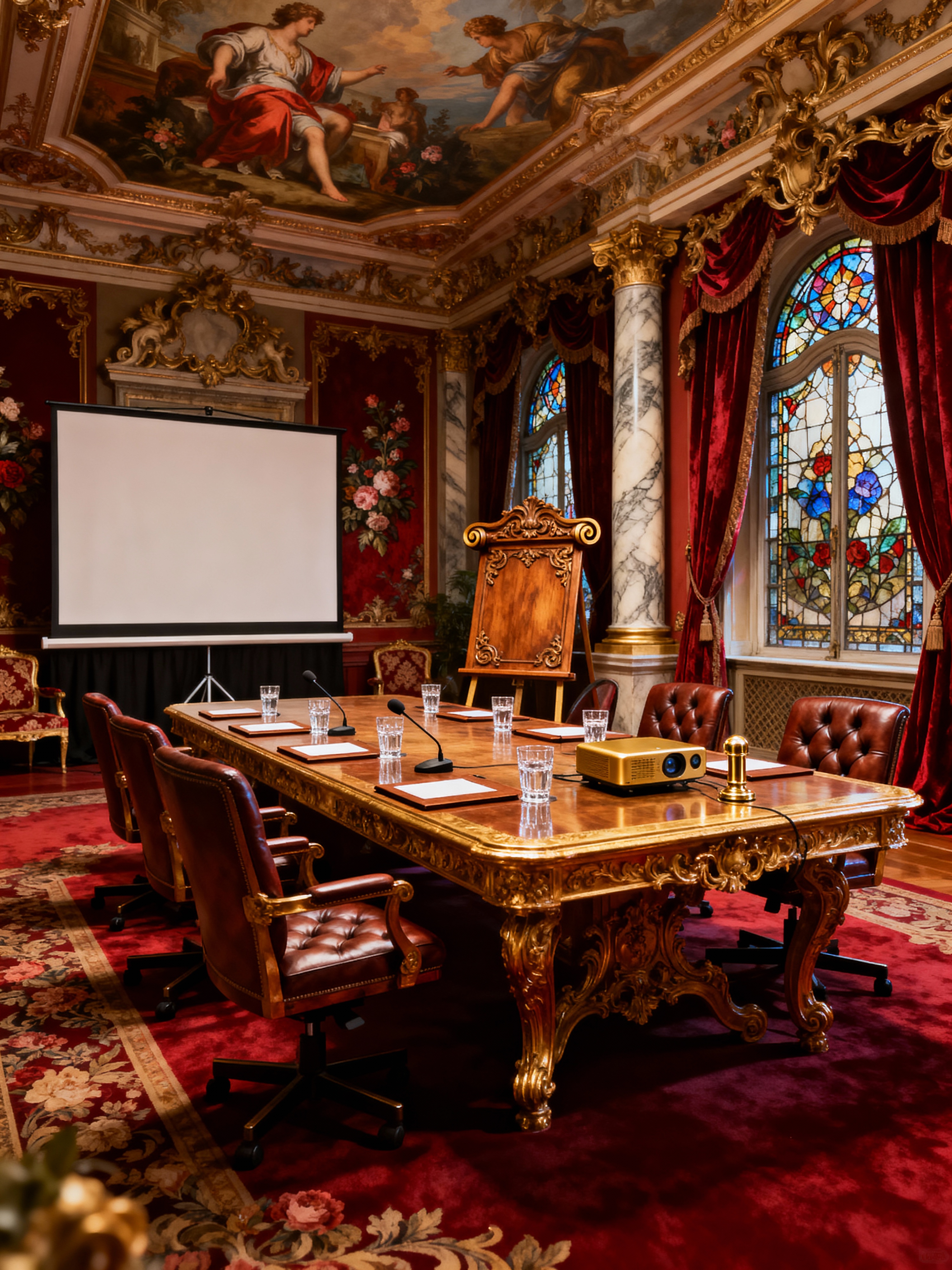 conference hall with baroque style with office chairs and notepads and conference table and projector and microphones and water glasses and projection screen and flipchart. . with elaborate ornamentation and tension and drama and dynamism and luxurious floral and damask fabrics and sensuous richness and heavy moldings and expensive and plush flooring