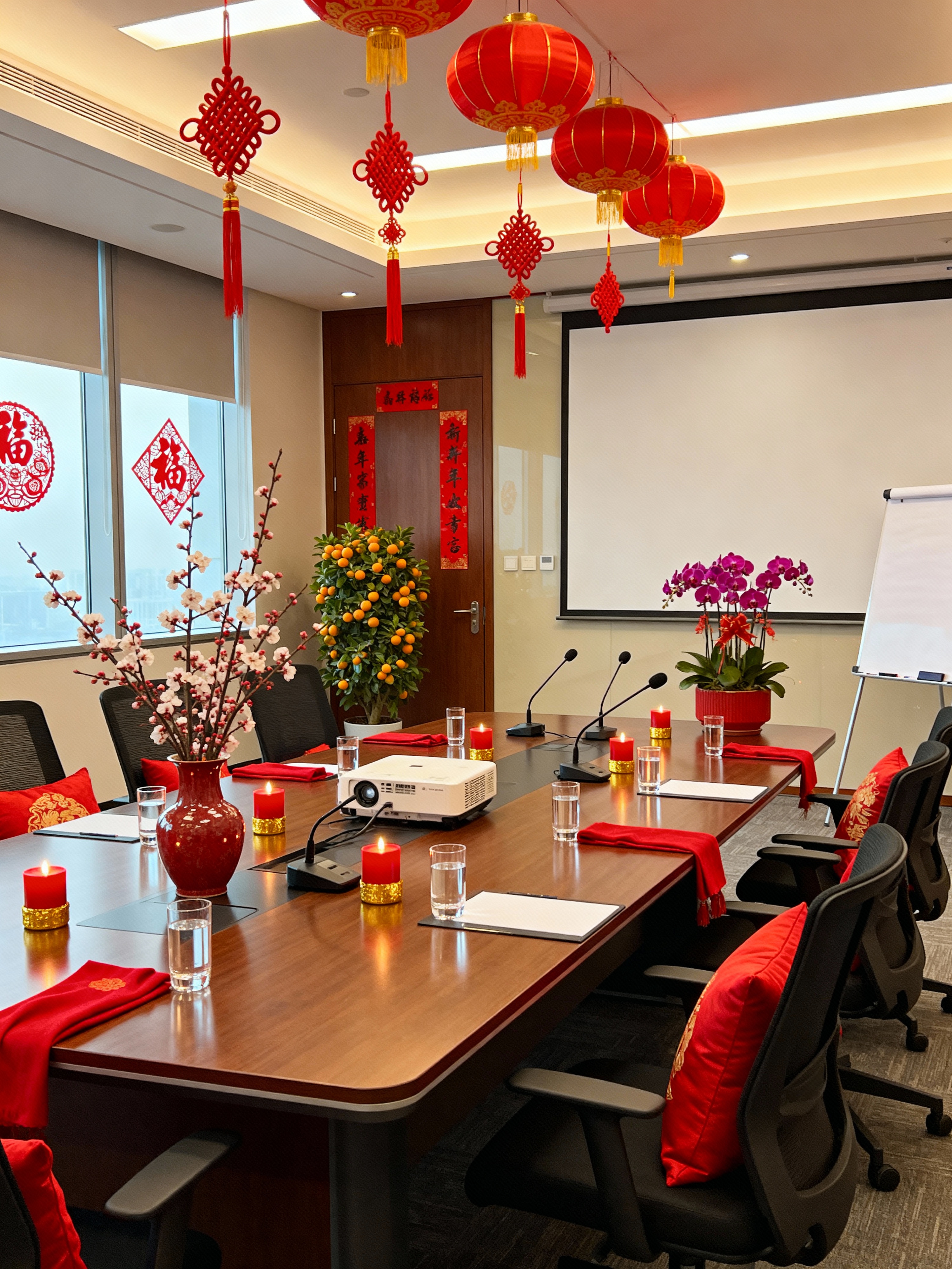 conference hall with chinese new year style with office chairs and water glasses and conference table and projector and whiteboard and microphones and projection screen and flipchart. . with red and gold candles and vases of plum blossoms and orchids and red fabric & pillows and kumquat trees and chinese knots and chinese red lanterns and paper cuttings and door couplets