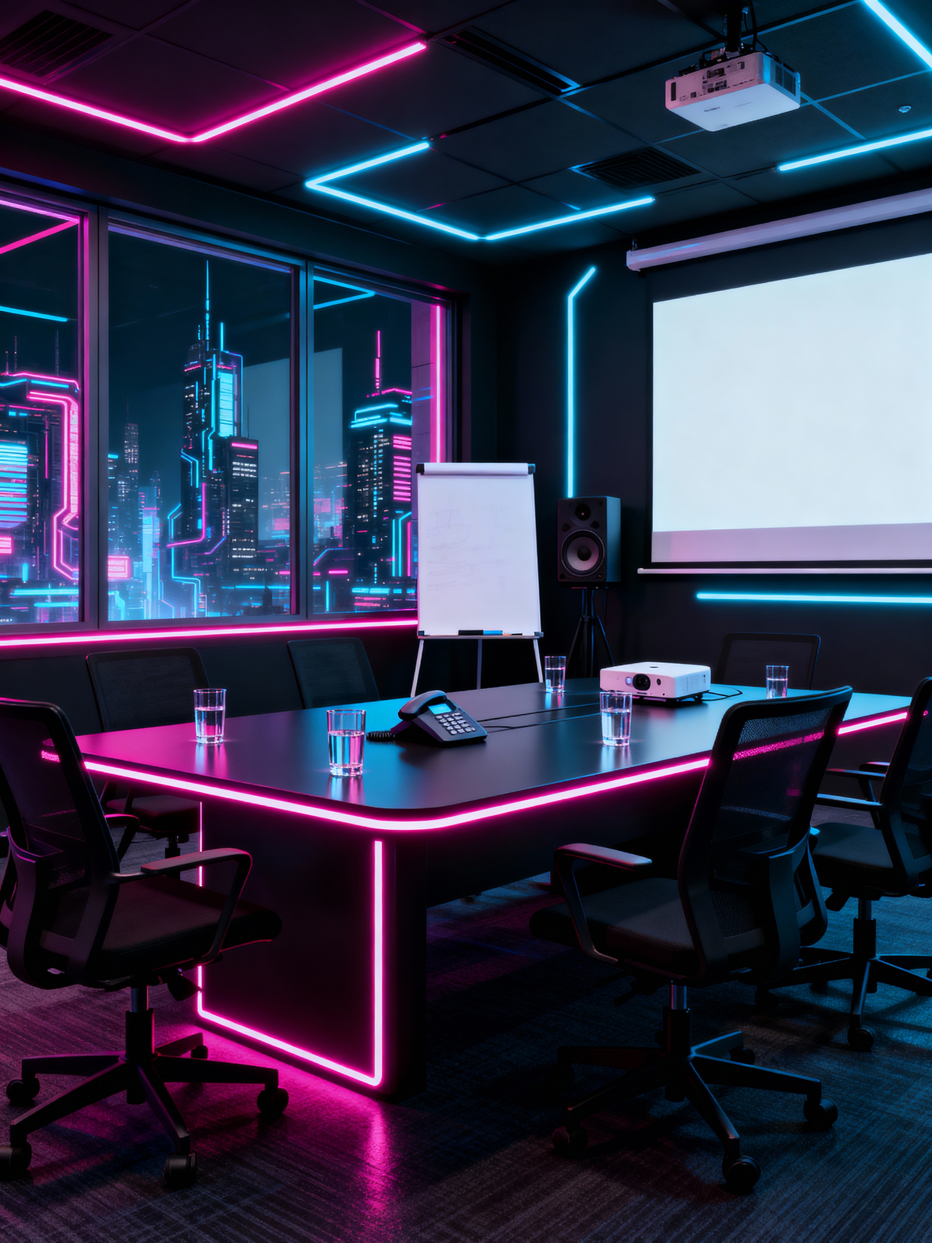 conference hall with cyberpunk style with water glasses and office chairs and whiteboard and conference table and speaker phone and projector and flipchart and projection screen. . with black lights and futuristic cybernetic details and bladerunner lights and futuristic cybernetic city and cyberpunk style and cyberpunk lights and led lights and synthwave