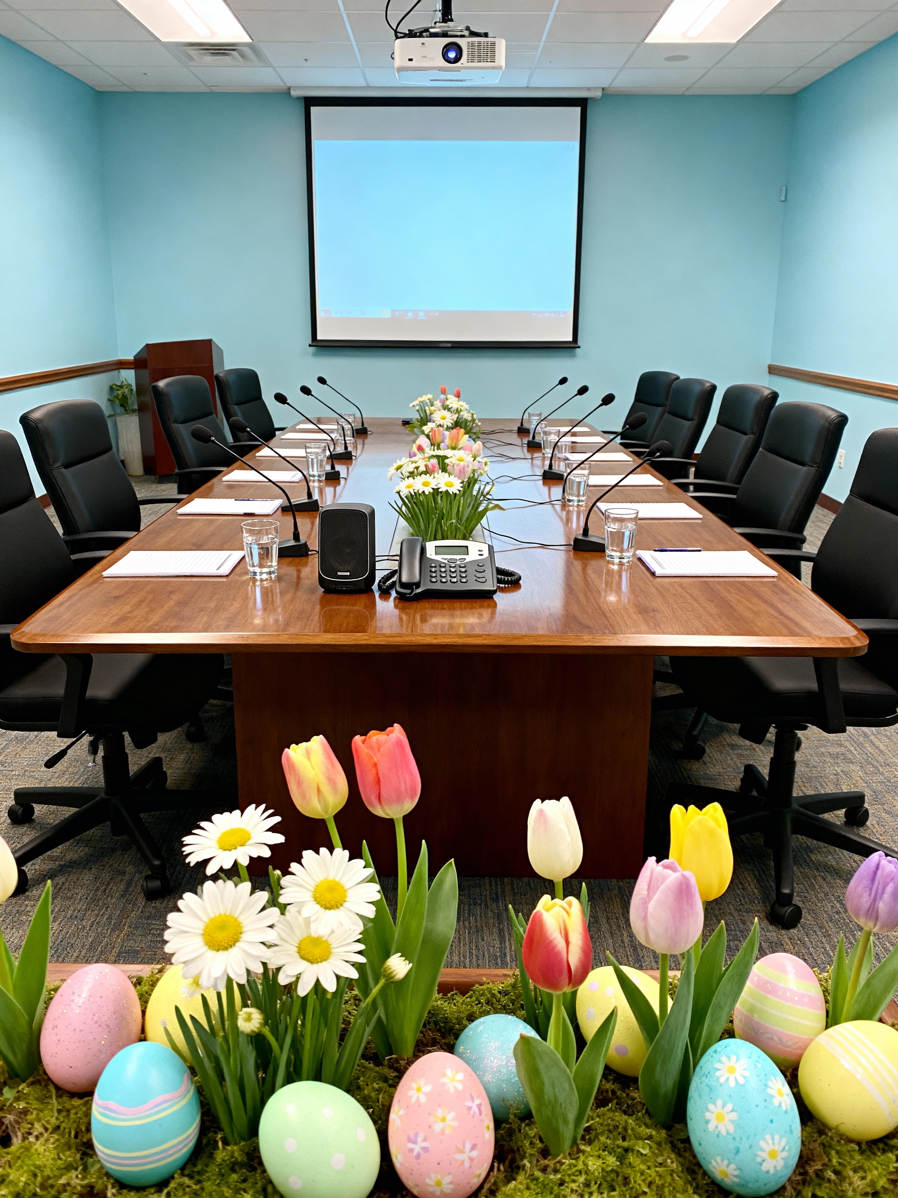 conference hall with easter style with conference table and office chairs and notepads and projector and projection screen and speaker phone and water glasses and microphones. . with spring decorations and flowers on table and colorful easter eggs and light blue colors and easter decorations and spring decorations