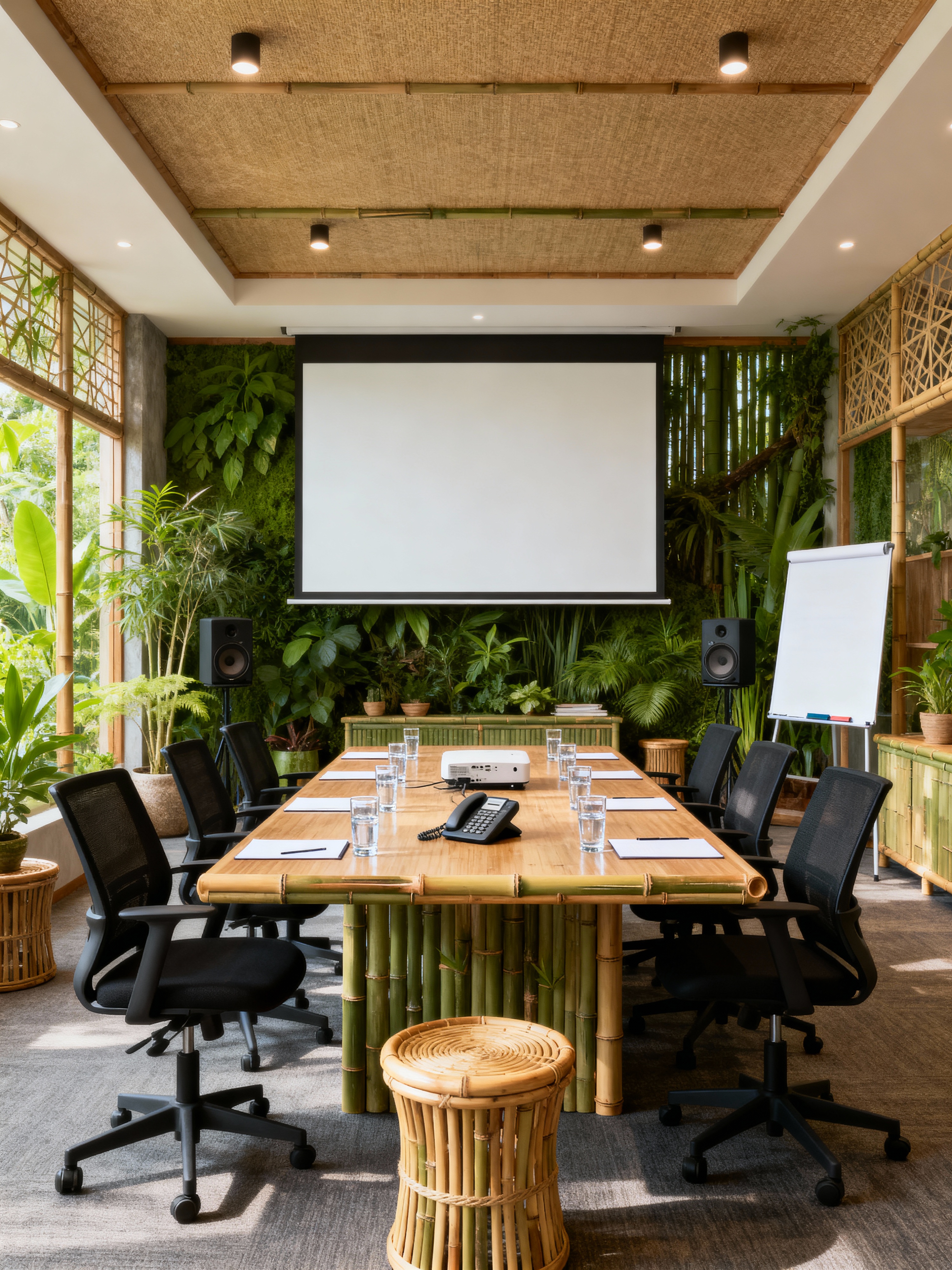 conference hall with eco-friendly style with projection screen and speaker phone and office chairs and water glasses and notepads and projector and conference table and whiteboard. . with green living and non-toxic finishes and energy efficient and renewable resources and recycled elements and environmentally conscious and organic textiles and bamboo furniture
