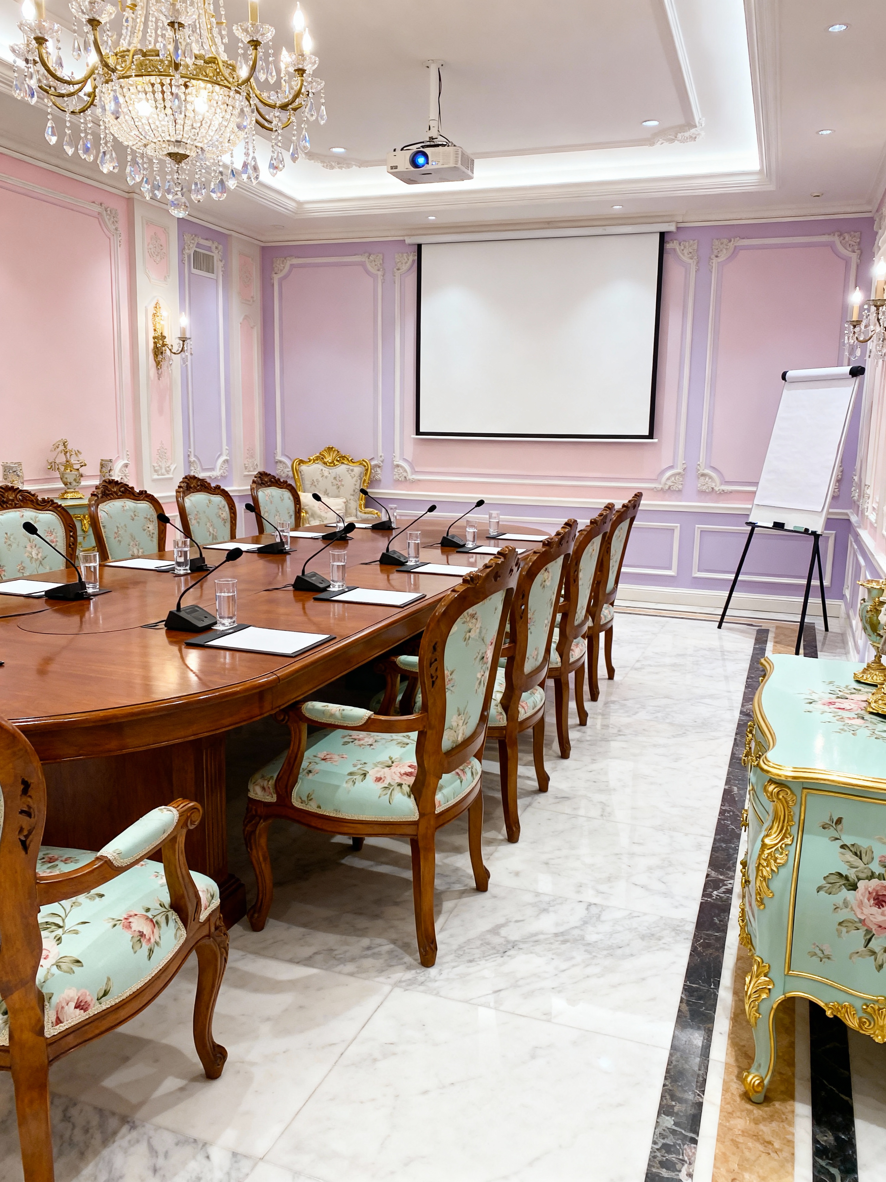 conference hall with french style with office chairs and microphones and whiteboard and projector and water glasses and notepads and conference table and flipchart. . with classic beauty and crystal accents and soft pastels and sophisticated grace and elegant details and ornate furniture and antique pieces and refined luxury
