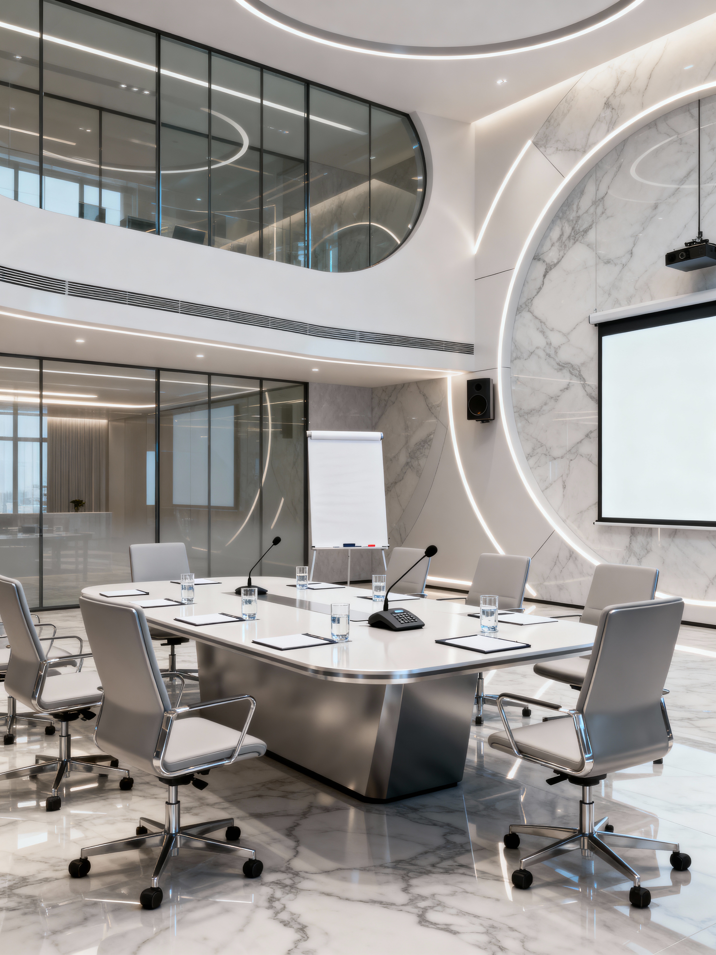 conference hall with futuristic style with whiteboard and office chairs and water glasses and flipchart and microphones and notepads and projection screen and speaker phone. . with smooth polished marble and smooth marble and glass panes and floating surfaces and circular shapes and strong geometric walls and neutral background and bright accents and steel finishing
