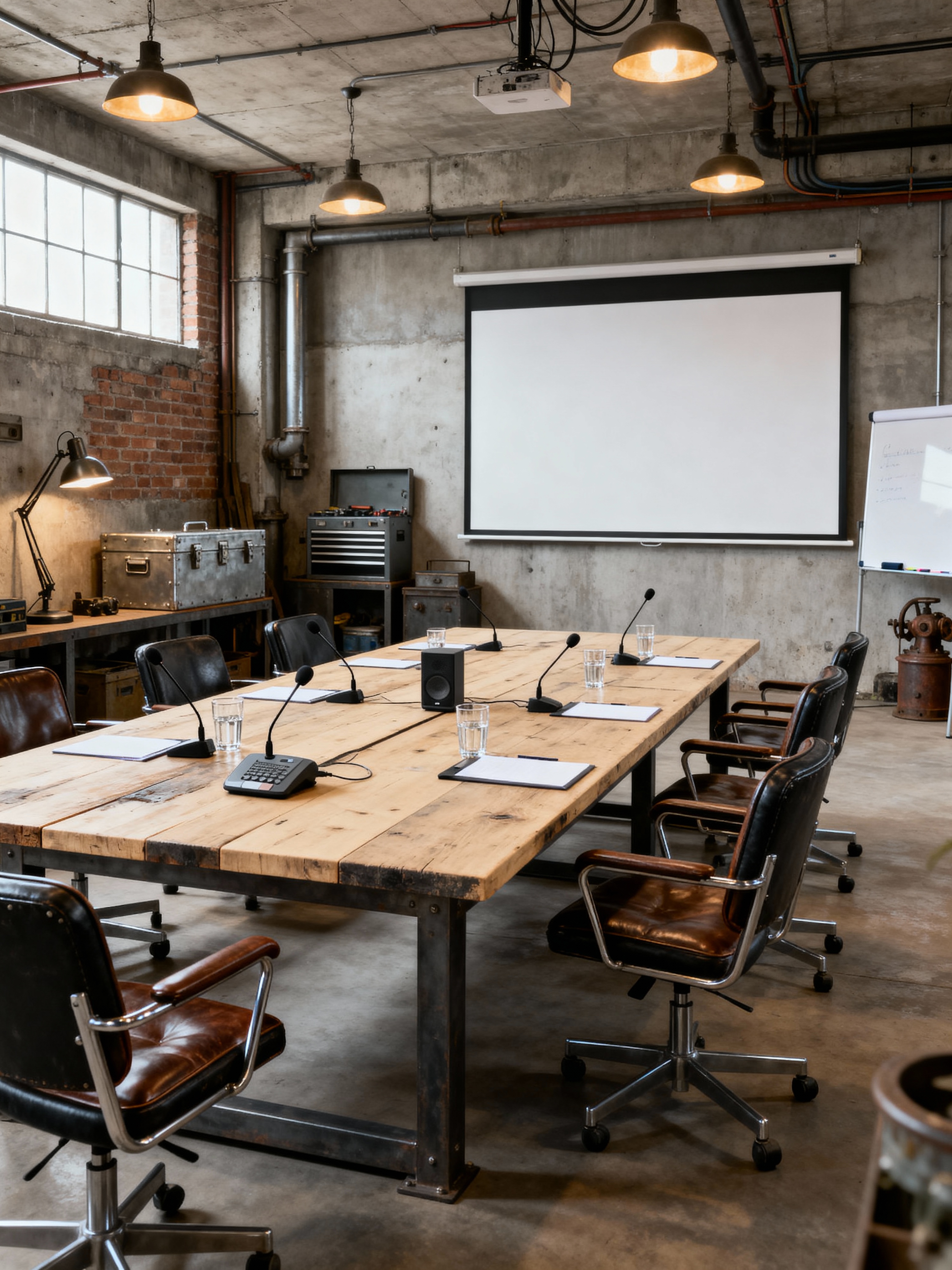 conference hall with industrial style with microphones and water glasses and whiteboard and conference table and speaker phone and notepads and projection screen and office chairs. . with exposed brick and neutral tones and open floorplan and exposed concrete and utilitarian objects and raw aesthetic and factory style and reclaimed wood