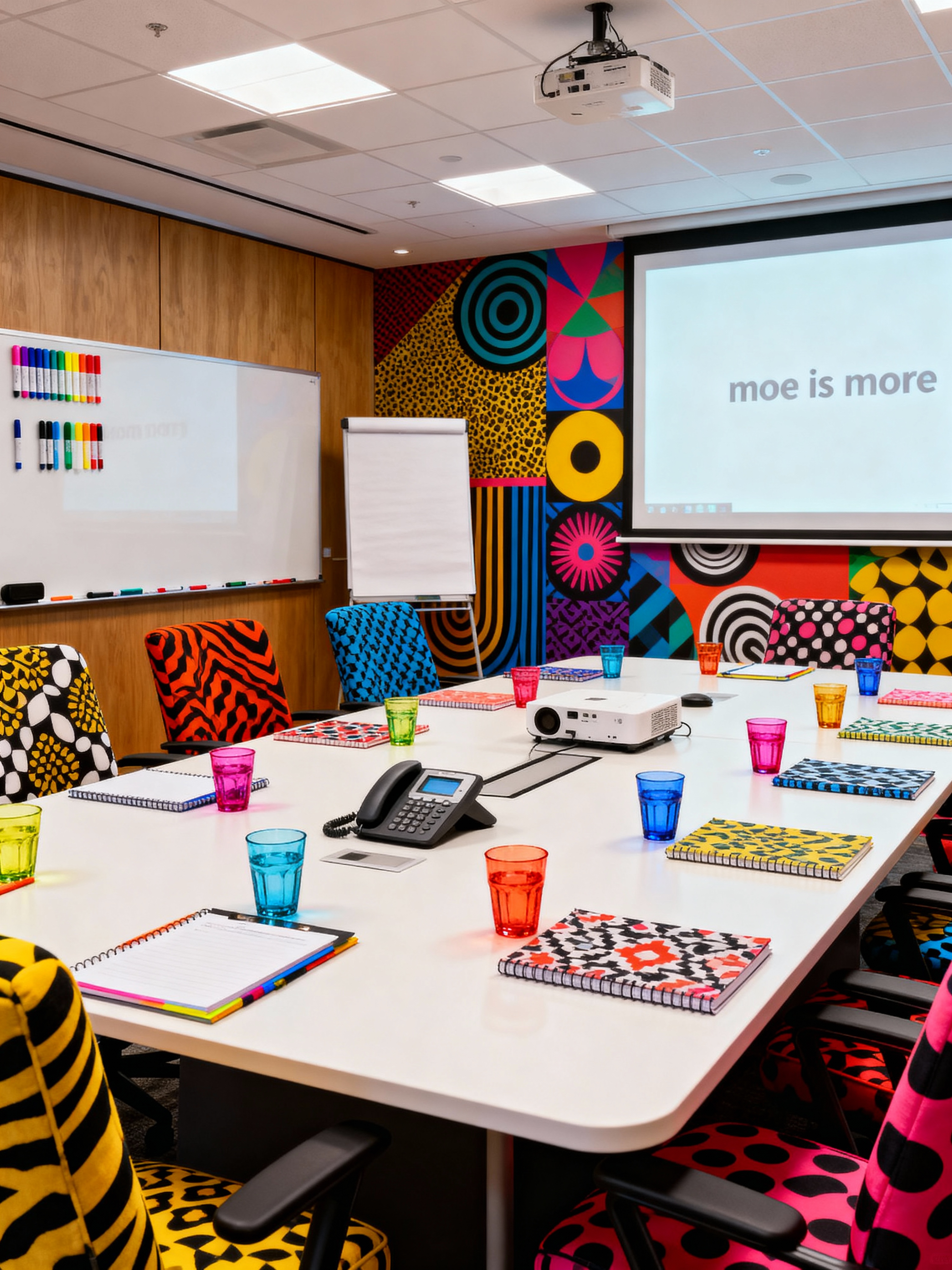 conference hall with maximalist style with speaker phone and whiteboard and projection screen and office chairs and conference table and notepads and water glasses and projector. . with more is more philosophy and bold patterns and bold creativity and playful and vibrant and bold colors and bold design and eye-catching