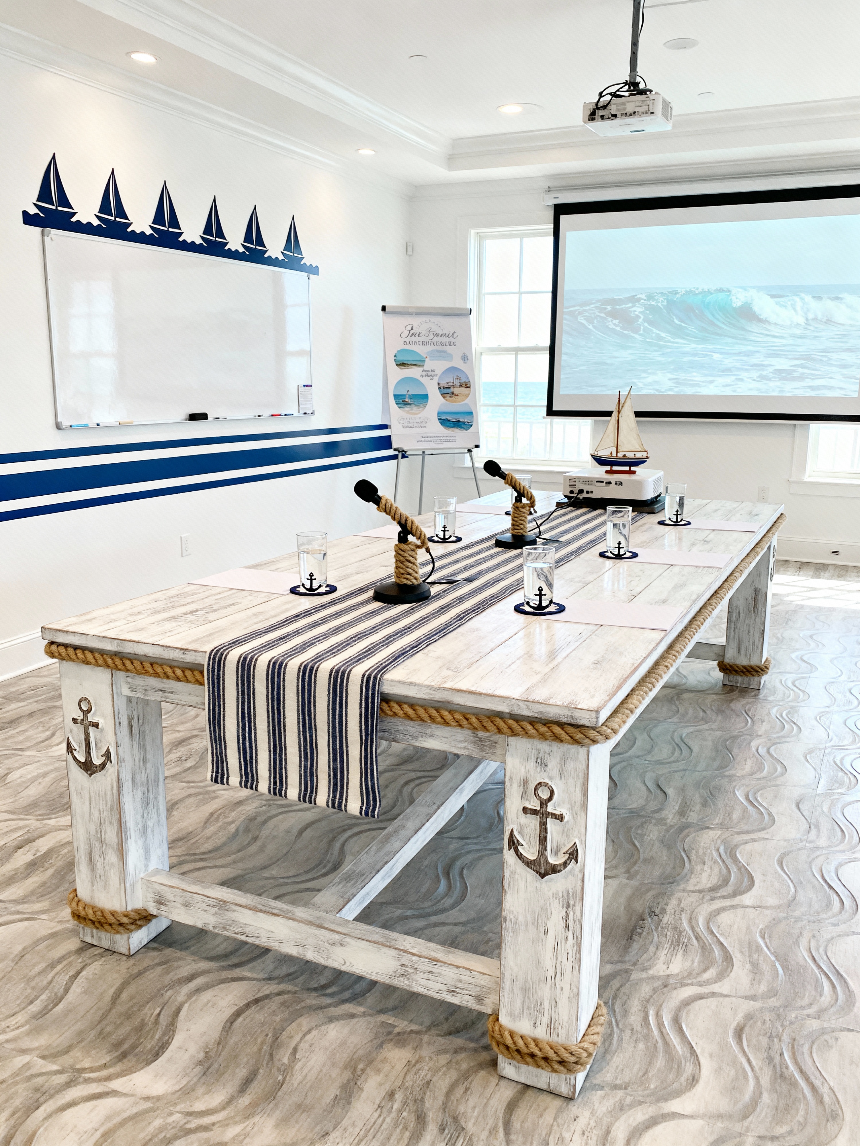 conference hall with nautical style with notepads and whiteboard and microphones and projection screen and water glasses and projector and flipchart and conference table. . with rope details and anchor motifs and coastal vibes and sailboat elements and striped patterns and ocean inspiration and weathered wood and crisp white