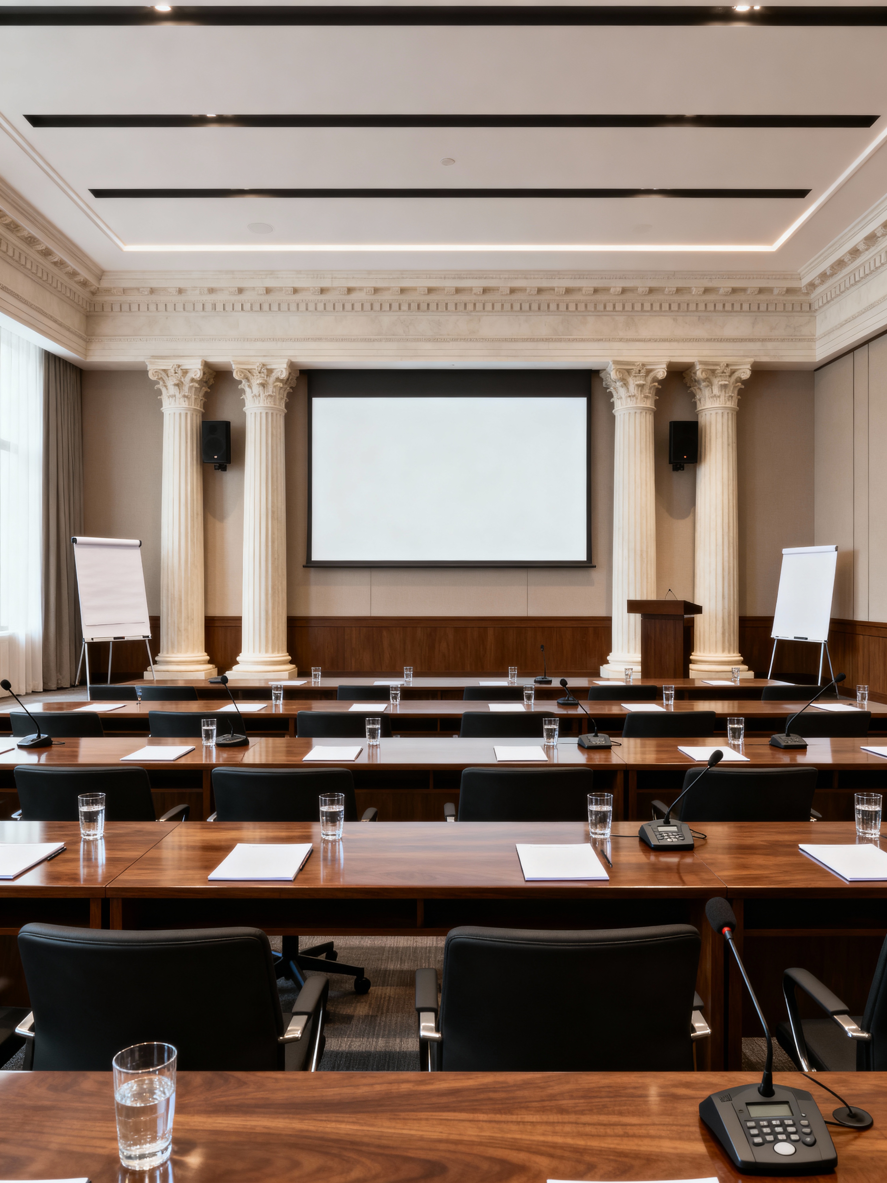 conference hall with neoclassic style with flipchart and water glasses and office chairs and projection screen and notepads and microphones and speaker phone and whiteboard. . with thoughtful minimalism and geometric decorative elements and timeless furniture and symmetric layouts and classical architectural details and elegant and sophisticated and greek columns and emphasized horizontal and vertical lines