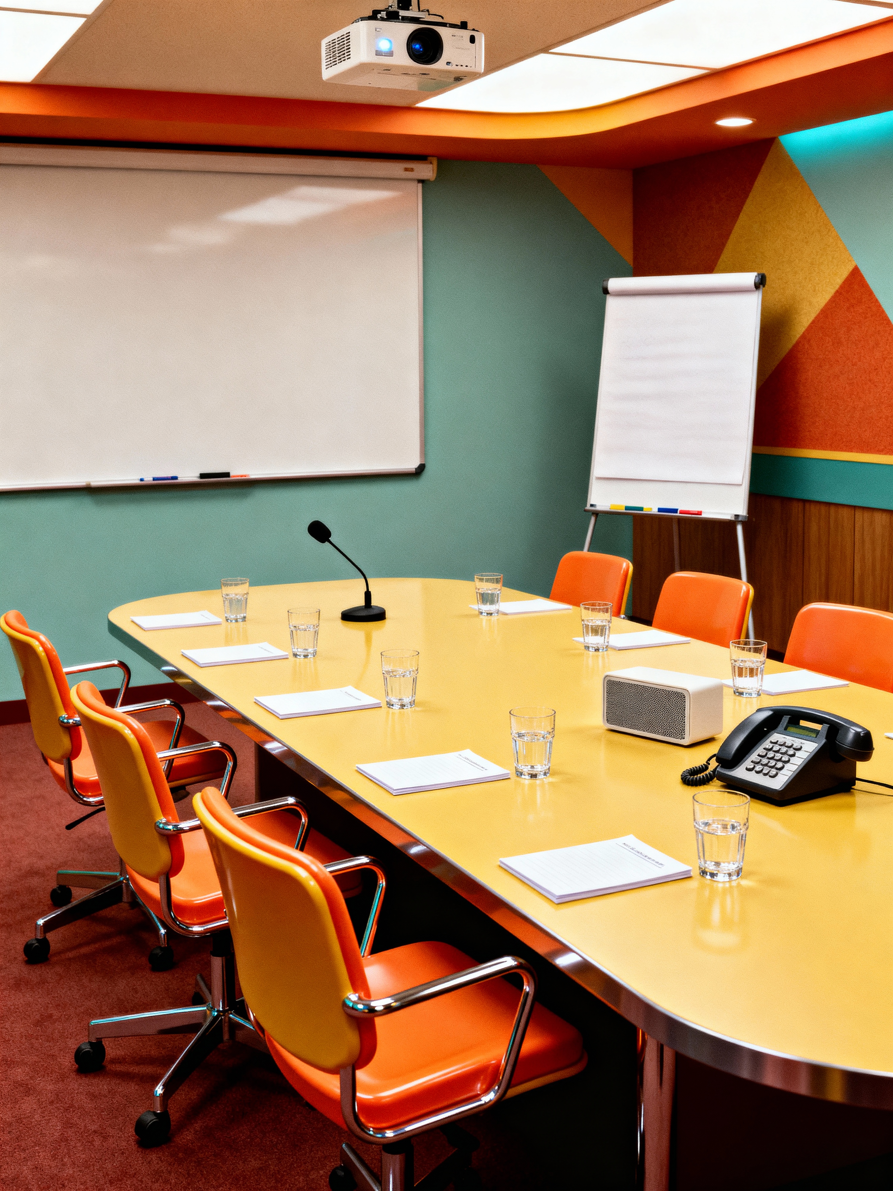 conference hall with retro style with water glasses and microphones and projector and whiteboard and notepads and flipchart and speaker phone and office chairs. . with space age and mod style and vintage revival and nostalgic pieces and chrome accents and plastic furniture and groovy vibes and geometric shapes
