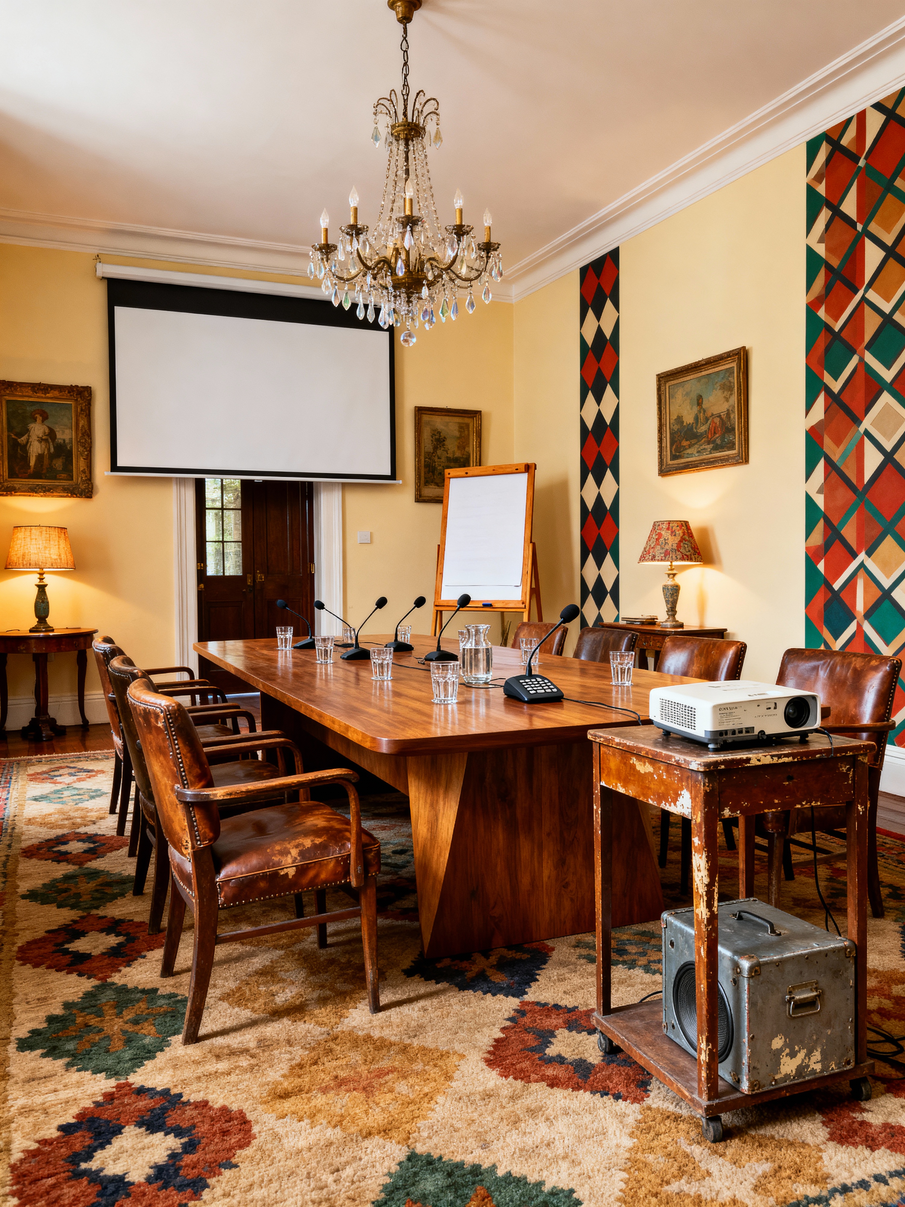 conference hall with vintage style with speaker phone and projection screen and flipchart and conference table and microphones and water glasses and whiteboard and projector. . with eclectic and antique decor and timeless pieces and bold patterns and nostalgic feel and shabby chic and colorful accents and mid-century