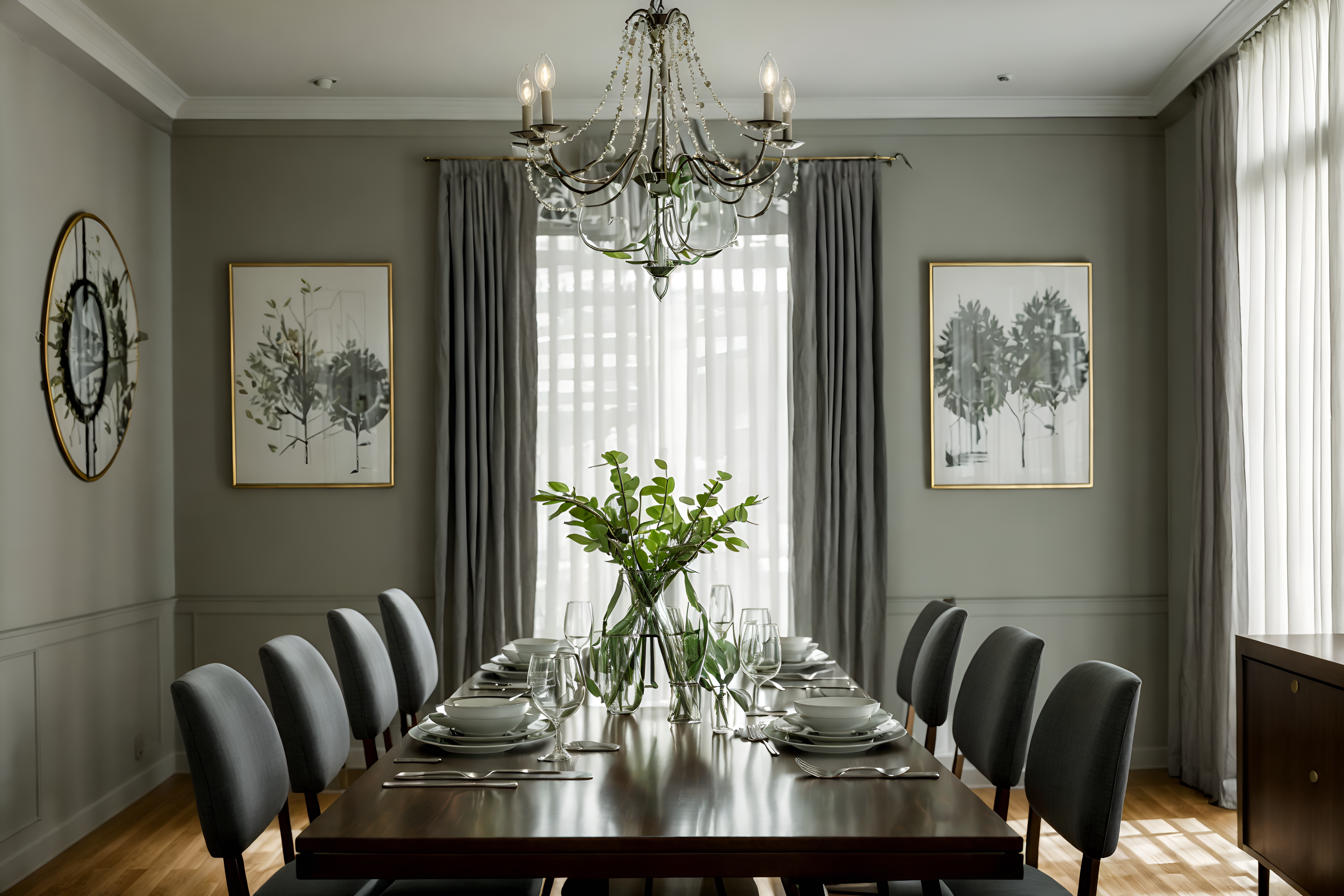 photo from pinterest of contemporary-style interior designed (dining room interior) with dining table chairs and plates, cutlery and glasses on dining table and dining table and light or chandelier and painting or photo on wall and table cloth and plant and vase. . with . . cinematic photo, highly detailed, cinematic lighting, ultra-detailed, ultrarealistic, photorealism, 8k. trending on pinterest. contemporary interior design style. masterpiece, cinematic light, ultrarealistic+, photorealistic+, 8k, raw photo, realistic, sharp focus on eyes, (symmetrical eyes), (intact eyes), hyperrealistic, highest quality, best quality, , highly detailed, masterpiece, best quality, extremely detailed 8k wallpaper, masterpiece, best quality, ultra-detailed, best shadow, detailed background, detailed face, detailed eyes, high contrast, best illumination, detailed face, dulux, caustic, dynamic angle, detailed glow. dramatic lighting. highly detailed, insanely detailed hair, symmetrical, intricate details, professionally retouched, 8k high definition. strong bokeh. award winning photo.