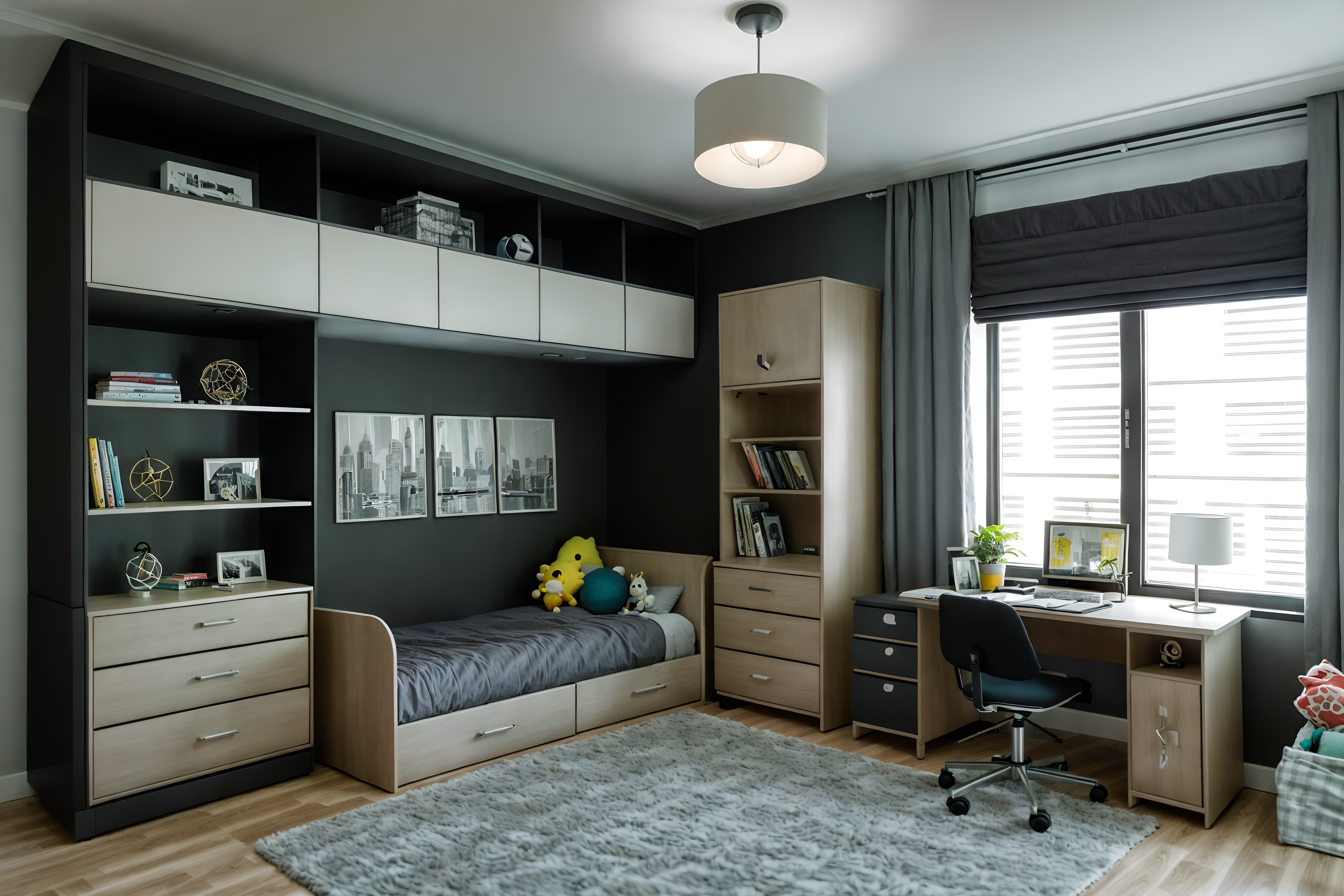 photo from pinterest of contemporary-style interior designed (kids room interior) with storage bench or ottoman and dresser closet and bed and plant and bedside table or night stand and night light and accent chair and kids desk. . with . . cinematic photo, highly detailed, cinematic lighting, ultra-detailed, ultrarealistic, photorealism, 8k. trending on pinterest. contemporary interior design style. masterpiece, cinematic light, ultrarealistic+, photorealistic+, 8k, raw photo, realistic, sharp focus on eyes, (symmetrical eyes), (intact eyes), hyperrealistic, highest quality, best quality, , highly detailed, masterpiece, best quality, extremely detailed 8k wallpaper, masterpiece, best quality, ultra-detailed, best shadow, detailed background, detailed face, detailed eyes, high contrast, best illumination, detailed face, dulux, caustic, dynamic angle, detailed glow. dramatic lighting. highly detailed, insanely detailed hair, symmetrical, intricate details, professionally retouched, 8k high definition. strong bokeh. award winning photo.