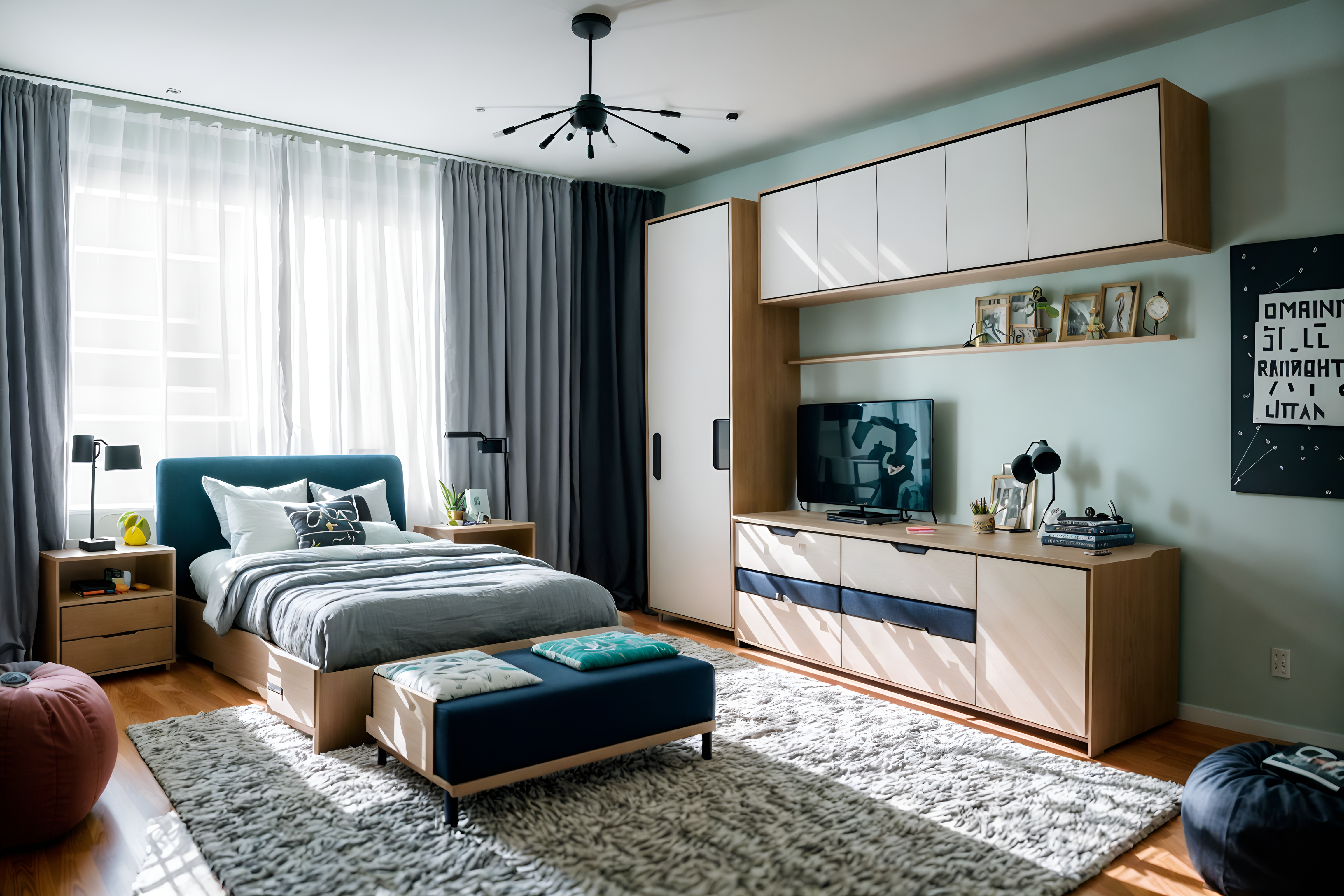 photo from pinterest of contemporary-style interior designed (kids room interior) with storage bench or ottoman and dresser closet and bed and plant and bedside table or night stand and night light and accent chair and kids desk. . with . . cinematic photo, highly detailed, cinematic lighting, ultra-detailed, ultrarealistic, photorealism, 8k. trending on pinterest. contemporary interior design style. masterpiece, cinematic light, ultrarealistic+, photorealistic+, 8k, raw photo, realistic, sharp focus on eyes, (symmetrical eyes), (intact eyes), hyperrealistic, highest quality, best quality, , highly detailed, masterpiece, best quality, extremely detailed 8k wallpaper, masterpiece, best quality, ultra-detailed, best shadow, detailed background, detailed face, detailed eyes, high contrast, best illumination, detailed face, dulux, caustic, dynamic angle, detailed glow. dramatic lighting. highly detailed, insanely detailed hair, symmetrical, intricate details, professionally retouched, 8k high definition. strong bokeh. award winning photo.