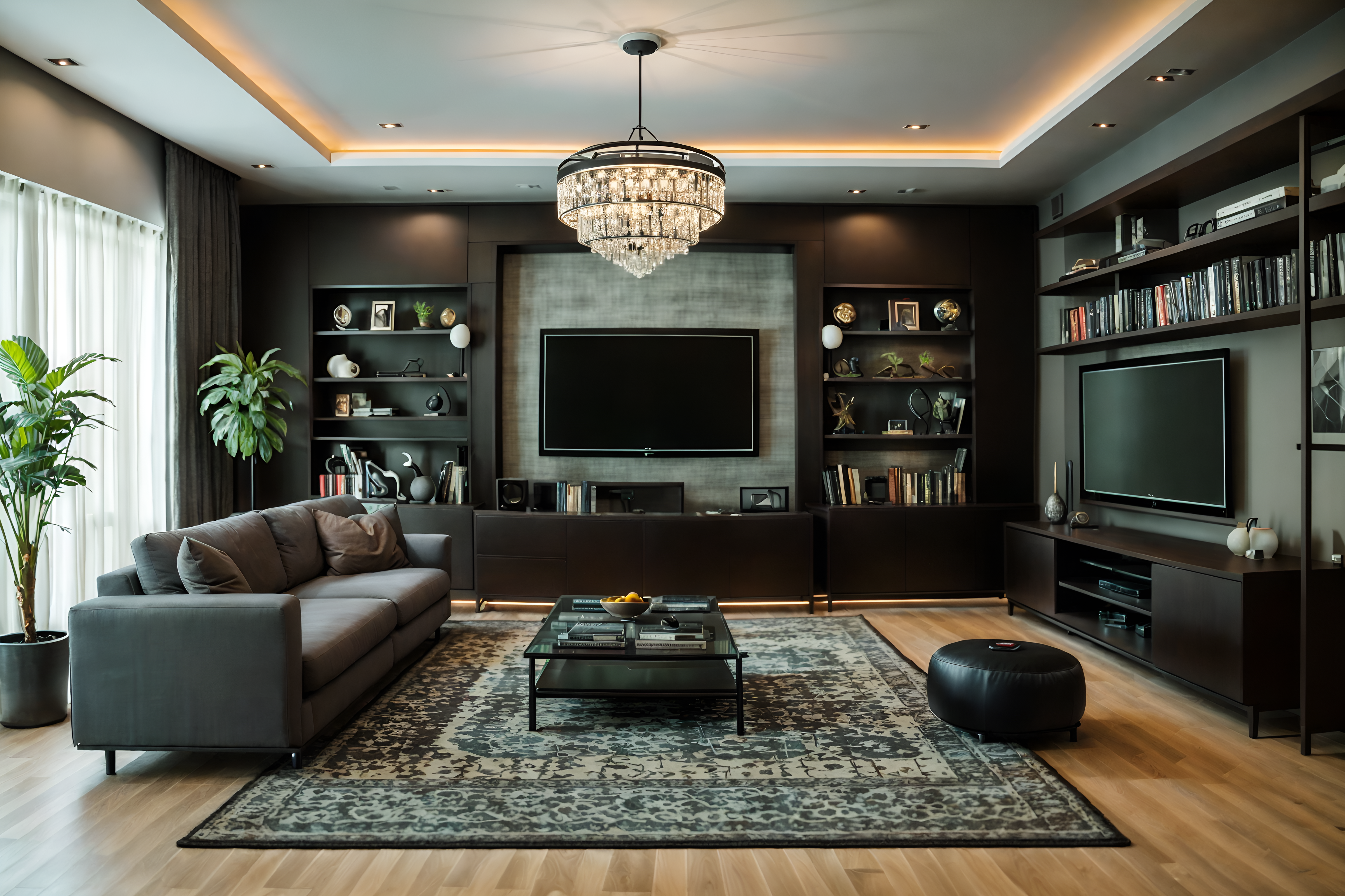 photo from pinterest of contemporary-style interior designed (living room interior) with televisions and bookshelves and coffee tables and electric lamps and chairs and plant and rug and occasional tables. . with . . cinematic photo, highly detailed, cinematic lighting, ultra-detailed, ultrarealistic, photorealism, 8k. trending on pinterest. contemporary interior design style. masterpiece, cinematic light, ultrarealistic+, photorealistic+, 8k, raw photo, realistic, sharp focus on eyes, (symmetrical eyes), (intact eyes), hyperrealistic, highest quality, best quality, , highly detailed, masterpiece, best quality, extremely detailed 8k wallpaper, masterpiece, best quality, ultra-detailed, best shadow, detailed background, detailed face, detailed eyes, high contrast, best illumination, detailed face, dulux, caustic, dynamic angle, detailed glow. dramatic lighting. highly detailed, insanely detailed hair, symmetrical, intricate details, professionally retouched, 8k high definition. strong bokeh. award winning photo.