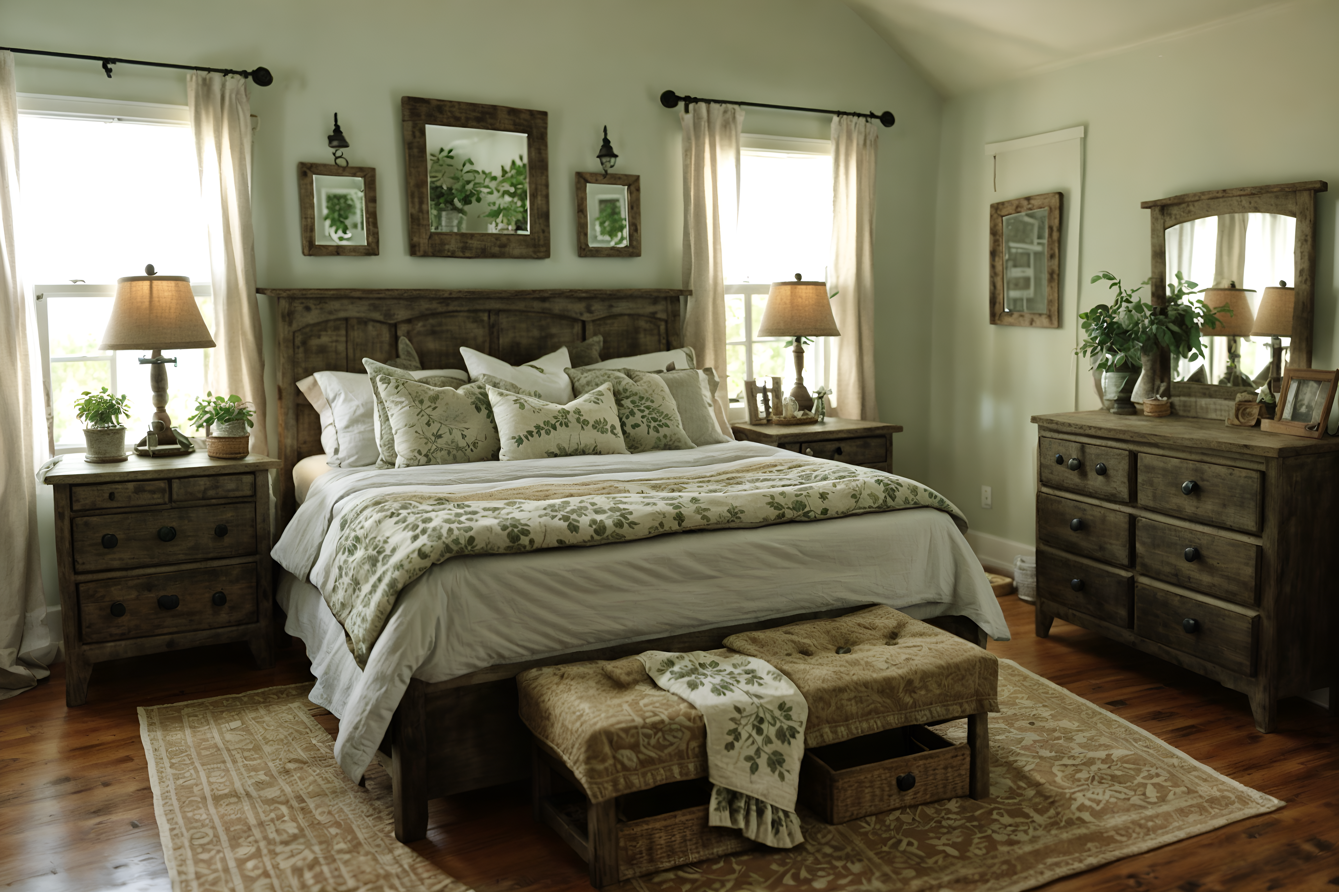 photo from pinterest of cottagecore-style interior designed (bedroom interior) with bedside table or night stand and dresser closet and night light and headboard and plant and mirror and bed and storage bench or ottoman. . with earthy and organic and natural and country style and cottage style and rustic and floral patterns and traditional. . cinematic photo, highly detailed, cinematic lighting, ultra-detailed, ultrarealistic, photorealism, 8k. trending on pinterest. cottagecore interior design style. masterpiece, cinematic light, ultrarealistic+, photorealistic+, 8k, raw photo, realistic, sharp focus on eyes, (symmetrical eyes), (intact eyes), hyperrealistic, highest quality, best quality, , highly detailed, masterpiece, best quality, extremely detailed 8k wallpaper, masterpiece, best quality, ultra-detailed, best shadow, detailed background, detailed face, detailed eyes, high contrast, best illumination, detailed face, dulux, caustic, dynamic angle, detailed glow. dramatic lighting. highly detailed, insanely detailed hair, symmetrical, intricate details, professionally retouched, 8k high definition. strong bokeh. award winning photo.