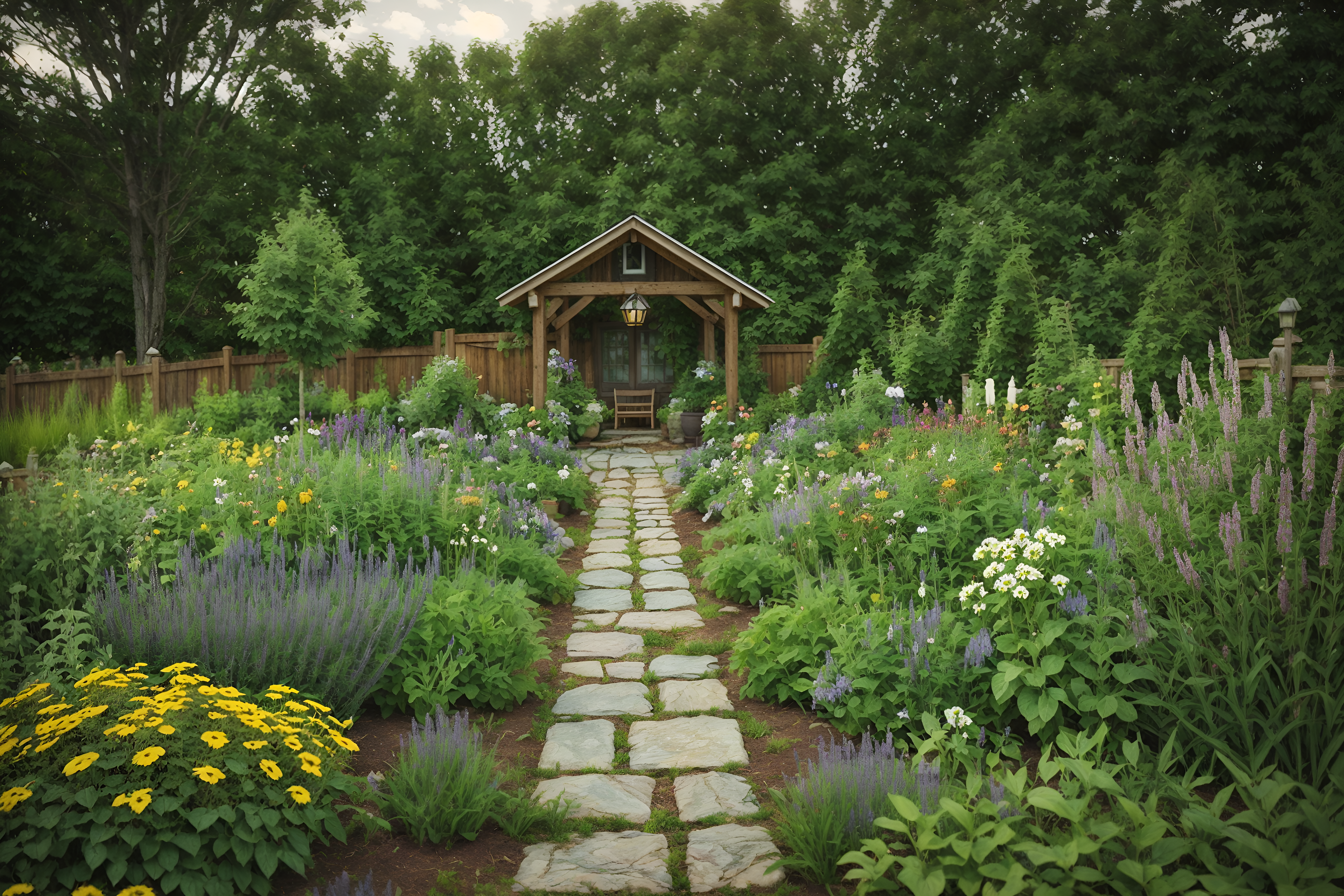 cottagecore outdoor gardensinterior decorate this outdoor garden with cottagecore style. . . with garden plants and grass and garden tree and garden plants. . with rustic and muted colors and floral patterns and cottage style and earthy and country style and traditional and natural. . .
