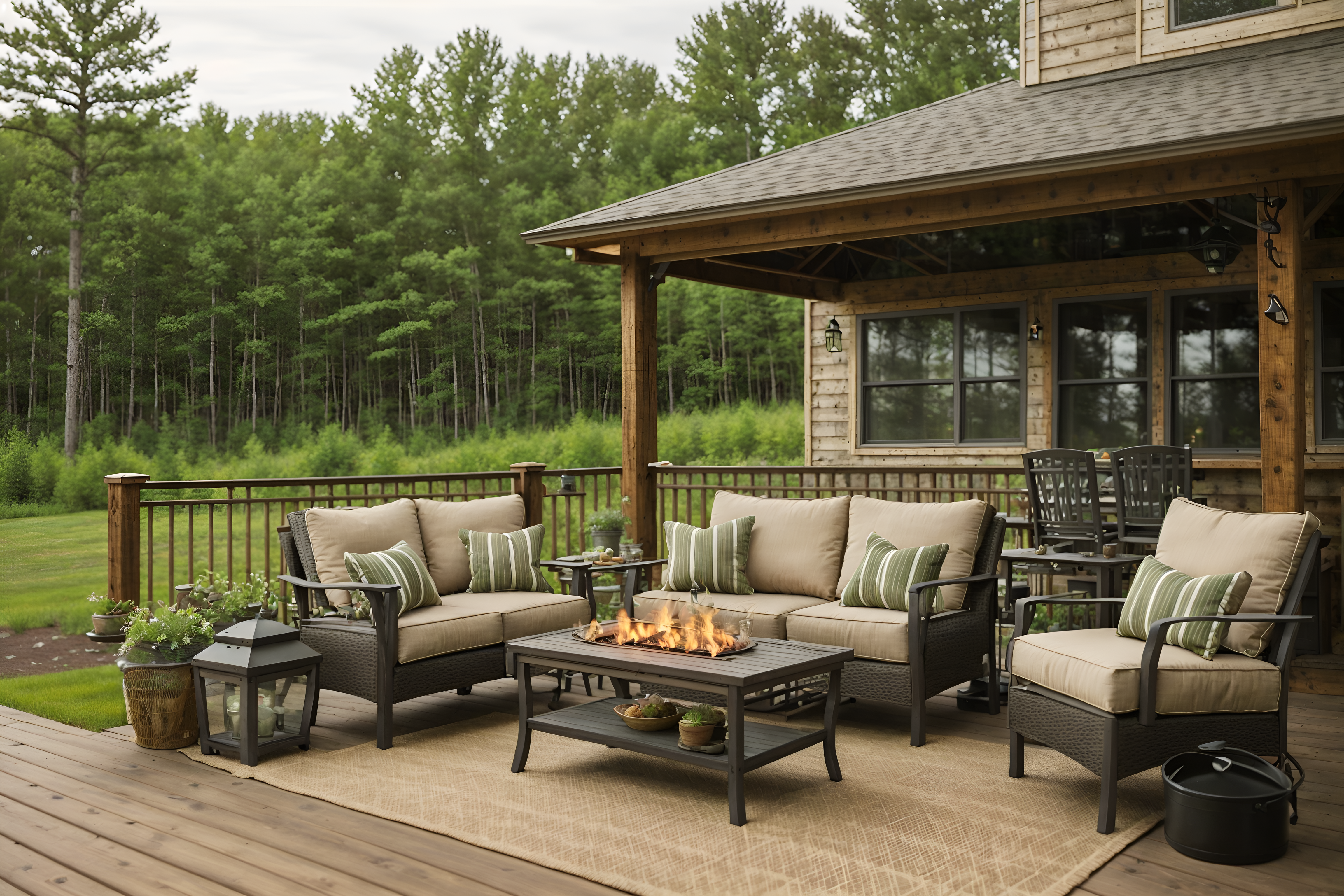 cottagecore outdoor patiosinterior decorate this outdoor patio with cottagecore style. . . with plant and deck with deck chairs and grass and barbeque or grill and patio couch with pillows and plant. . with organic and country style and earthy and traditional and cottage style and muted colors and floral patterns and rustic. . .