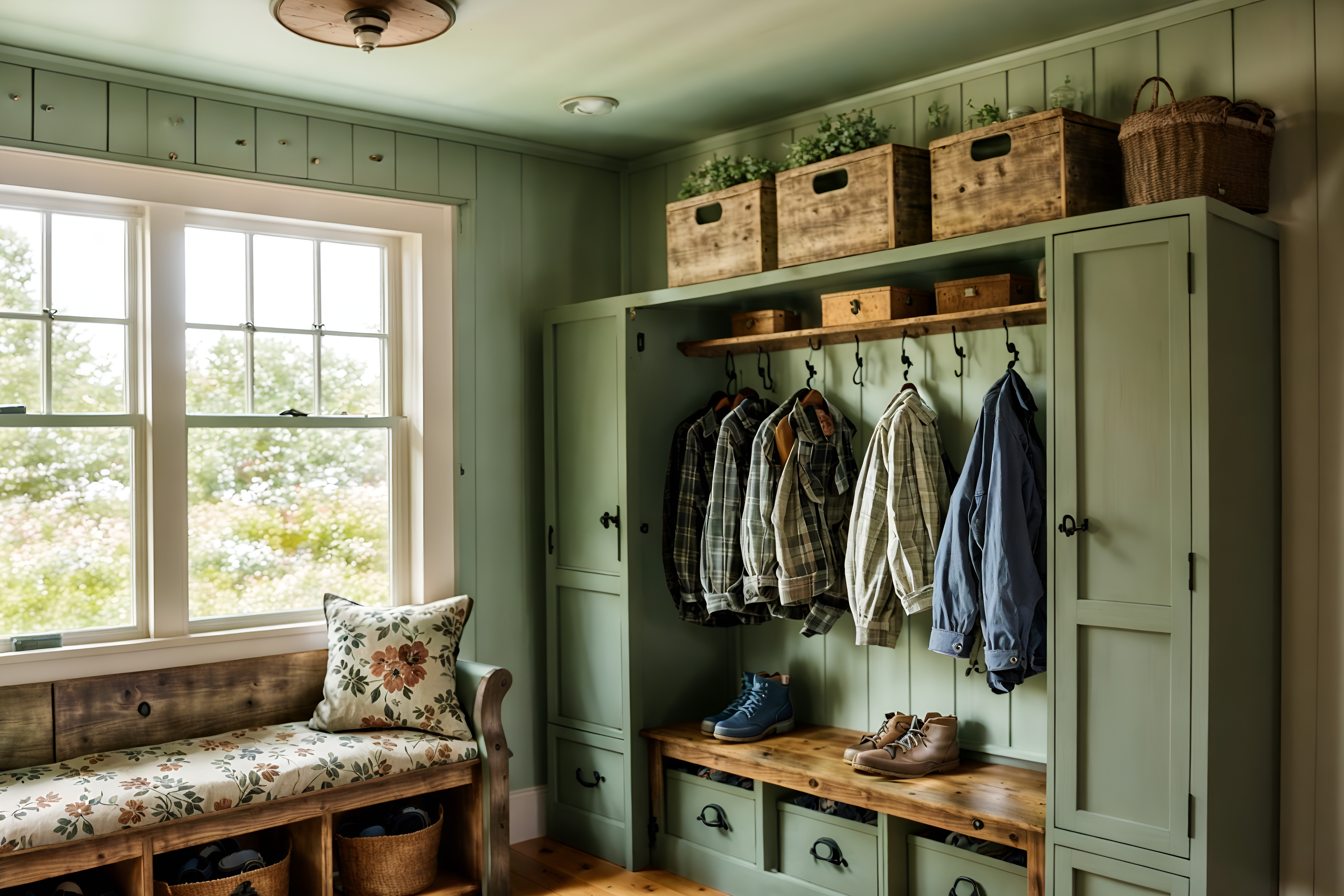 photo from pinterest of cottagecore-style interior designed (drop zone interior) with lockers and a bench and cubbies and shelves for shoes and high up storage and storage drawers and cabinets and wall hooks for coats. . with floral patterns and cottage style and rustic and natural and country style and muted colors and traditional and earthy. . cinematic photo, highly detailed, cinematic lighting, ultra-detailed, ultrarealistic, photorealism, 8k. trending on pinterest. cottagecore interior design style. masterpiece, cinematic light, ultrarealistic+, photorealistic+, 8k, raw photo, realistic, sharp focus on eyes, (symmetrical eyes), (intact eyes), hyperrealistic, highest quality, best quality, , highly detailed, masterpiece, best quality, extremely detailed 8k wallpaper, masterpiece, best quality, ultra-detailed, best shadow, detailed background, detailed face, detailed eyes, high contrast, best illumination, detailed face, dulux, caustic, dynamic angle, detailed glow. dramatic lighting. highly detailed, insanely detailed hair, symmetrical, intricate details, professionally retouched, 8k high definition. strong bokeh. award winning photo.
