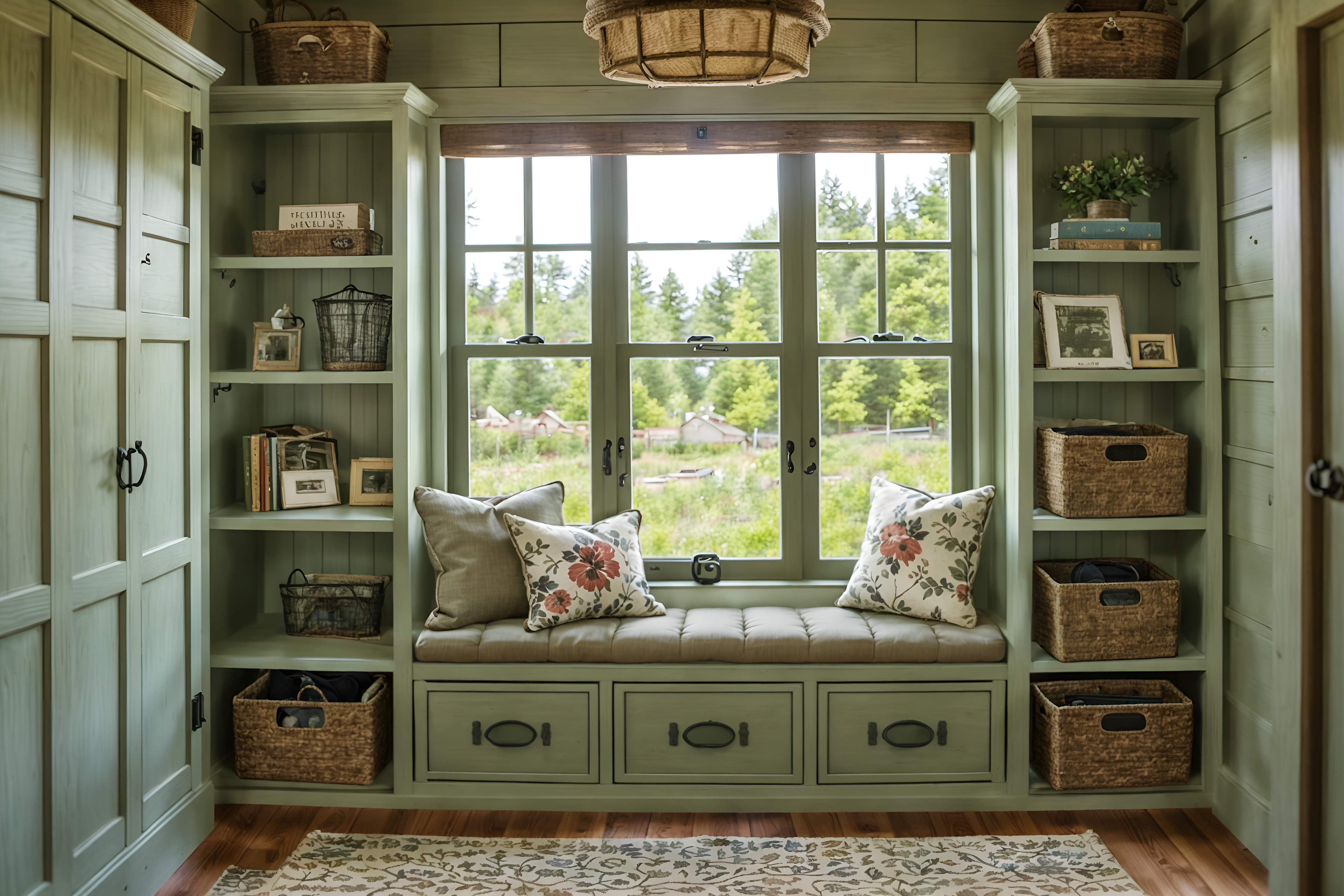 photo from pinterest of cottagecore-style interior designed (drop zone interior) with lockers and a bench and cubbies and shelves for shoes and high up storage and storage drawers and cabinets and wall hooks for coats. . with floral patterns and cottage style and rustic and natural and country style and muted colors and traditional and earthy. . cinematic photo, highly detailed, cinematic lighting, ultra-detailed, ultrarealistic, photorealism, 8k. trending on pinterest. cottagecore interior design style. masterpiece, cinematic light, ultrarealistic+, photorealistic+, 8k, raw photo, realistic, sharp focus on eyes, (symmetrical eyes), (intact eyes), hyperrealistic, highest quality, best quality, , highly detailed, masterpiece, best quality, extremely detailed 8k wallpaper, masterpiece, best quality, ultra-detailed, best shadow, detailed background, detailed face, detailed eyes, high contrast, best illumination, detailed face, dulux, caustic, dynamic angle, detailed glow. dramatic lighting. highly detailed, insanely detailed hair, symmetrical, intricate details, professionally retouched, 8k high definition. strong bokeh. award winning photo.