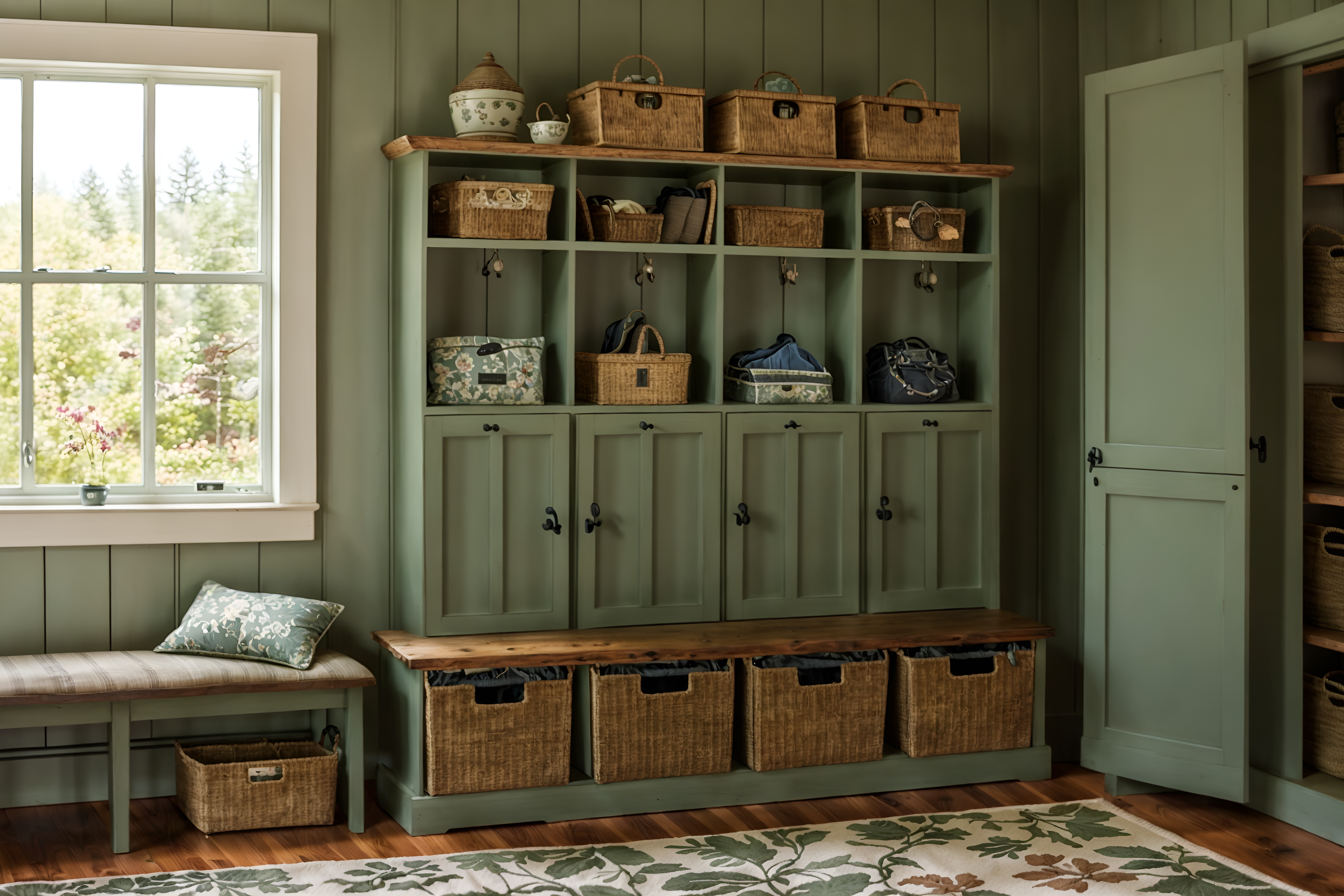 photo from pinterest of cottagecore-style interior designed (drop zone interior) with lockers and a bench and cubbies and shelves for shoes and high up storage and storage drawers and cabinets and wall hooks for coats. . with floral patterns and cottage style and rustic and natural and country style and muted colors and traditional and earthy. . cinematic photo, highly detailed, cinematic lighting, ultra-detailed, ultrarealistic, photorealism, 8k. trending on pinterest. cottagecore interior design style. masterpiece, cinematic light, ultrarealistic+, photorealistic+, 8k, raw photo, realistic, sharp focus on eyes, (symmetrical eyes), (intact eyes), hyperrealistic, highest quality, best quality, , highly detailed, masterpiece, best quality, extremely detailed 8k wallpaper, masterpiece, best quality, ultra-detailed, best shadow, detailed background, detailed face, detailed eyes, high contrast, best illumination, detailed face, dulux, caustic, dynamic angle, detailed glow. dramatic lighting. highly detailed, insanely detailed hair, symmetrical, intricate details, professionally retouched, 8k high definition. strong bokeh. award winning photo.