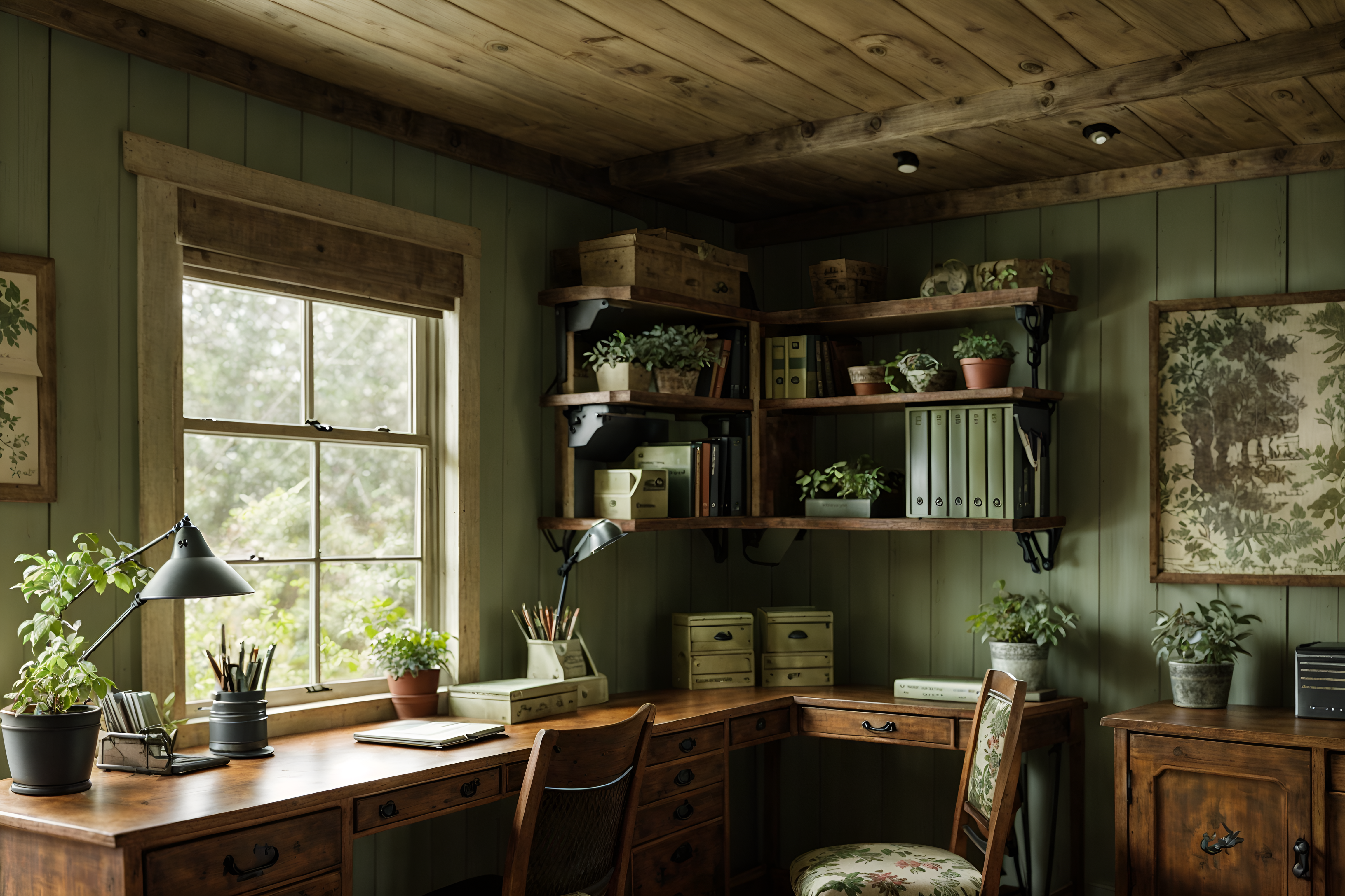 photo from pinterest of cottagecore-style interior designed (home office interior) with plant and cabinets and office chair and desk lamp and computer desk and plant. . with traditional and country style and floral patterns and organic and muted colors and cottage style and rustic and natural. . cinematic photo, highly detailed, cinematic lighting, ultra-detailed, ultrarealistic, photorealism, 8k. trending on pinterest. cottagecore interior design style. masterpiece, cinematic light, ultrarealistic+, photorealistic+, 8k, raw photo, realistic, sharp focus on eyes, (symmetrical eyes), (intact eyes), hyperrealistic, highest quality, best quality, , highly detailed, masterpiece, best quality, extremely detailed 8k wallpaper, masterpiece, best quality, ultra-detailed, best shadow, detailed background, detailed face, detailed eyes, high contrast, best illumination, detailed face, dulux, caustic, dynamic angle, detailed glow. dramatic lighting. highly detailed, insanely detailed hair, symmetrical, intricate details, professionally retouched, 8k high definition. strong bokeh. award winning photo.