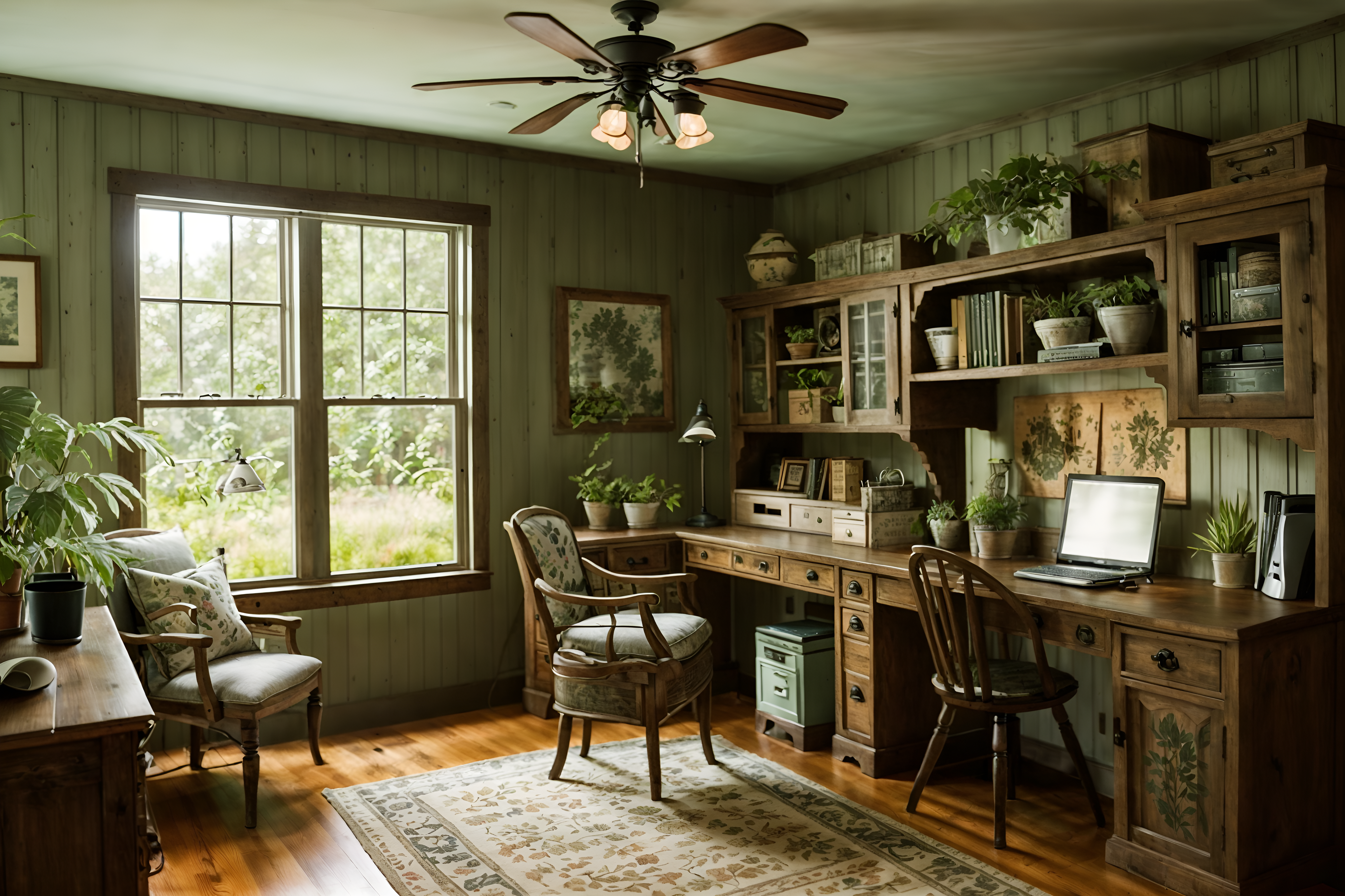 photo from pinterest of cottagecore-style interior designed (home office interior) with plant and cabinets and office chair and desk lamp and computer desk and plant. . with traditional and country style and floral patterns and organic and muted colors and cottage style and rustic and natural. . cinematic photo, highly detailed, cinematic lighting, ultra-detailed, ultrarealistic, photorealism, 8k. trending on pinterest. cottagecore interior design style. masterpiece, cinematic light, ultrarealistic+, photorealistic+, 8k, raw photo, realistic, sharp focus on eyes, (symmetrical eyes), (intact eyes), hyperrealistic, highest quality, best quality, , highly detailed, masterpiece, best quality, extremely detailed 8k wallpaper, masterpiece, best quality, ultra-detailed, best shadow, detailed background, detailed face, detailed eyes, high contrast, best illumination, detailed face, dulux, caustic, dynamic angle, detailed glow. dramatic lighting. highly detailed, insanely detailed hair, symmetrical, intricate details, professionally retouched, 8k high definition. strong bokeh. award winning photo.