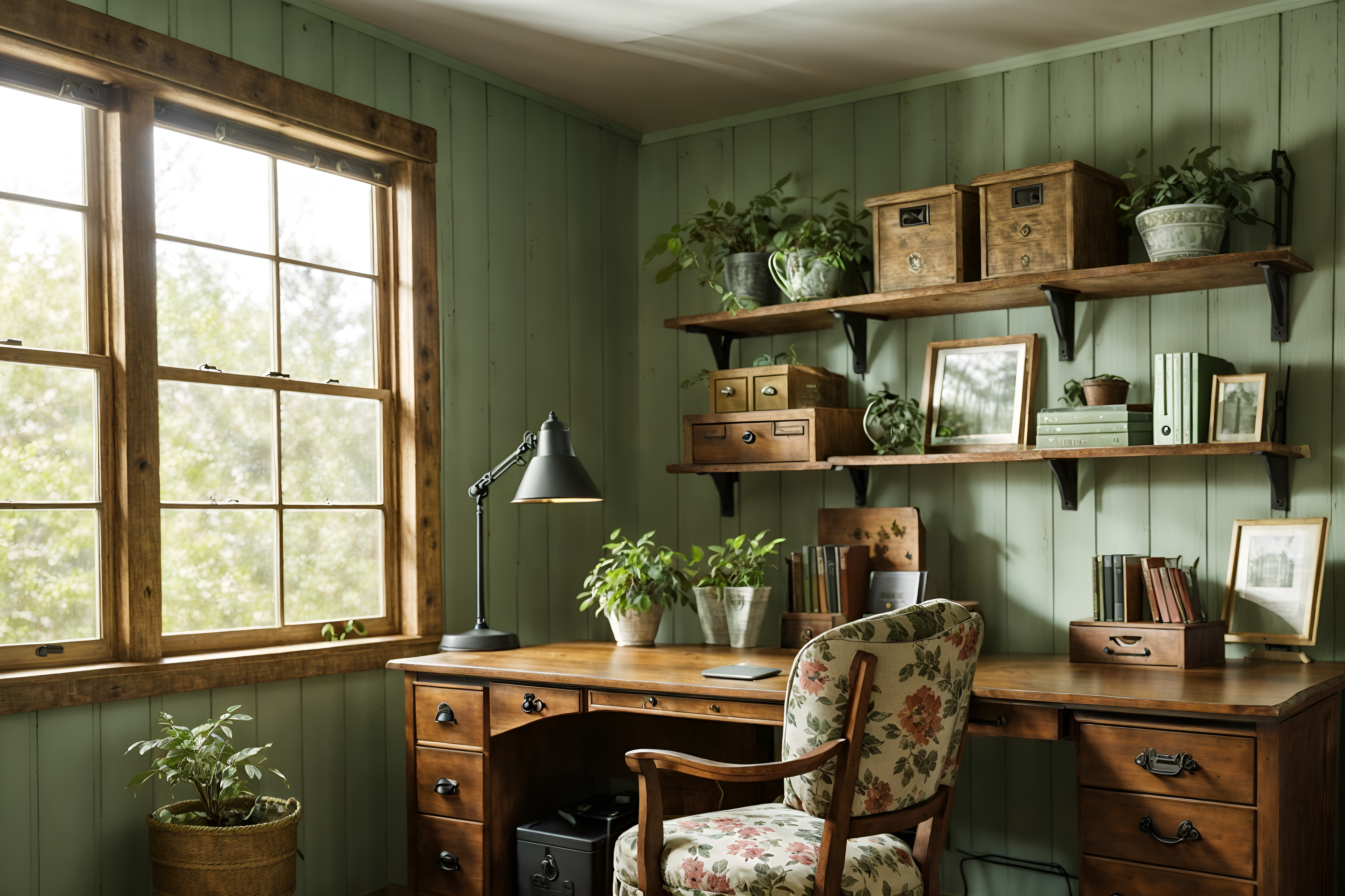 photo from pinterest of cottagecore-style interior designed (home office interior) with plant and cabinets and office chair and desk lamp and computer desk and plant. . with traditional and country style and floral patterns and organic and muted colors and cottage style and rustic and natural. . cinematic photo, highly detailed, cinematic lighting, ultra-detailed, ultrarealistic, photorealism, 8k. trending on pinterest. cottagecore interior design style. masterpiece, cinematic light, ultrarealistic+, photorealistic+, 8k, raw photo, realistic, sharp focus on eyes, (symmetrical eyes), (intact eyes), hyperrealistic, highest quality, best quality, , highly detailed, masterpiece, best quality, extremely detailed 8k wallpaper, masterpiece, best quality, ultra-detailed, best shadow, detailed background, detailed face, detailed eyes, high contrast, best illumination, detailed face, dulux, caustic, dynamic angle, detailed glow. dramatic lighting. highly detailed, insanely detailed hair, symmetrical, intricate details, professionally retouched, 8k high definition. strong bokeh. award winning photo.