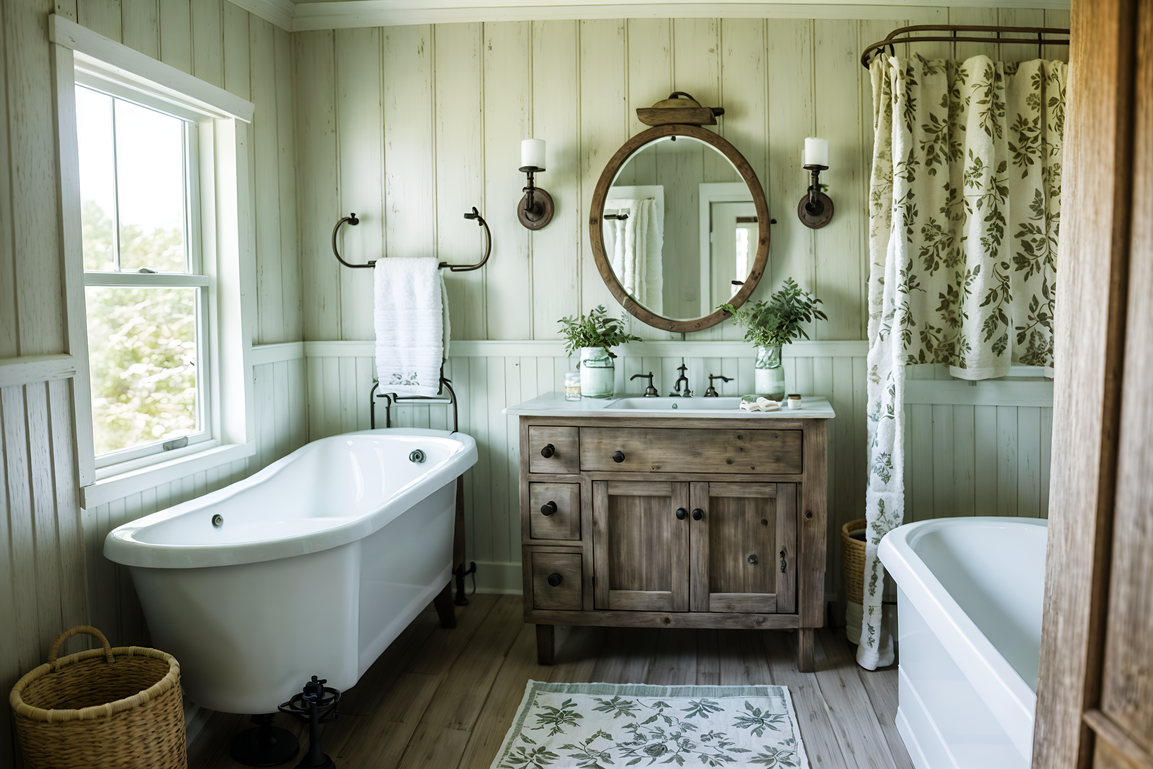 photo from pinterest of cottagecore-style interior designed (hotel bathroom interior) with bath towel and plant and toilet seat and shower and bathroom cabinet and bathtub and bath rail and mirror. . with traditional and cottage style and rustic and country style and floral patterns and organic and earthy and muted colors. . cinematic photo, highly detailed, cinematic lighting, ultra-detailed, ultrarealistic, photorealism, 8k. trending on pinterest. cottagecore interior design style. masterpiece, cinematic light, ultrarealistic+, photorealistic+, 8k, raw photo, realistic, sharp focus on eyes, (symmetrical eyes), (intact eyes), hyperrealistic, highest quality, best quality, , highly detailed, masterpiece, best quality, extremely detailed 8k wallpaper, masterpiece, best quality, ultra-detailed, best shadow, detailed background, detailed face, detailed eyes, high contrast, best illumination, detailed face, dulux, caustic, dynamic angle, detailed glow. dramatic lighting. highly detailed, insanely detailed hair, symmetrical, intricate details, professionally retouched, 8k high definition. strong bokeh. award winning photo.