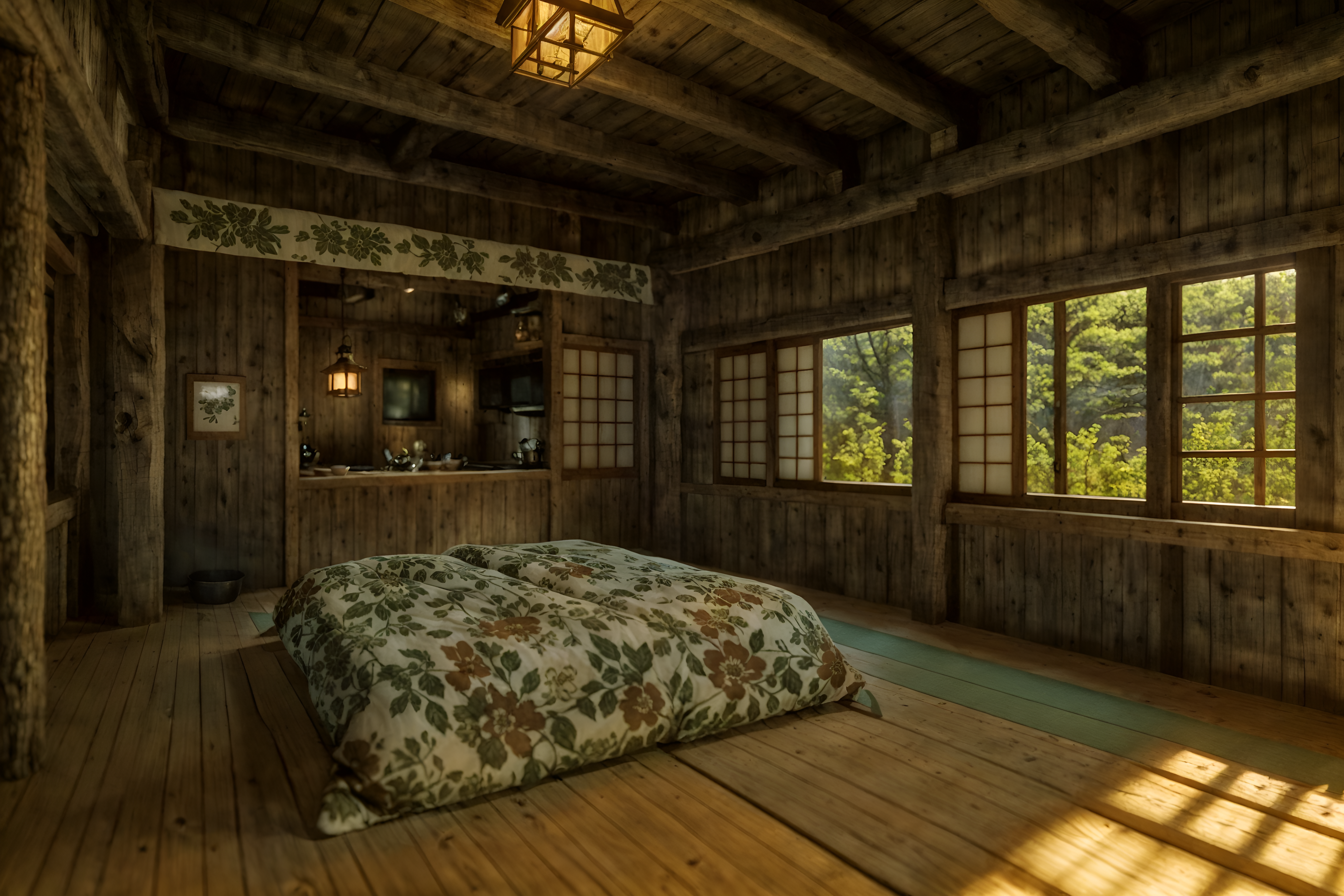 cottagecore onsensinterior decorate this onsen with cottagecore style. . . . with rustic and organic and floral patterns and earthy and natural and cottage style and country style and traditional. . .
