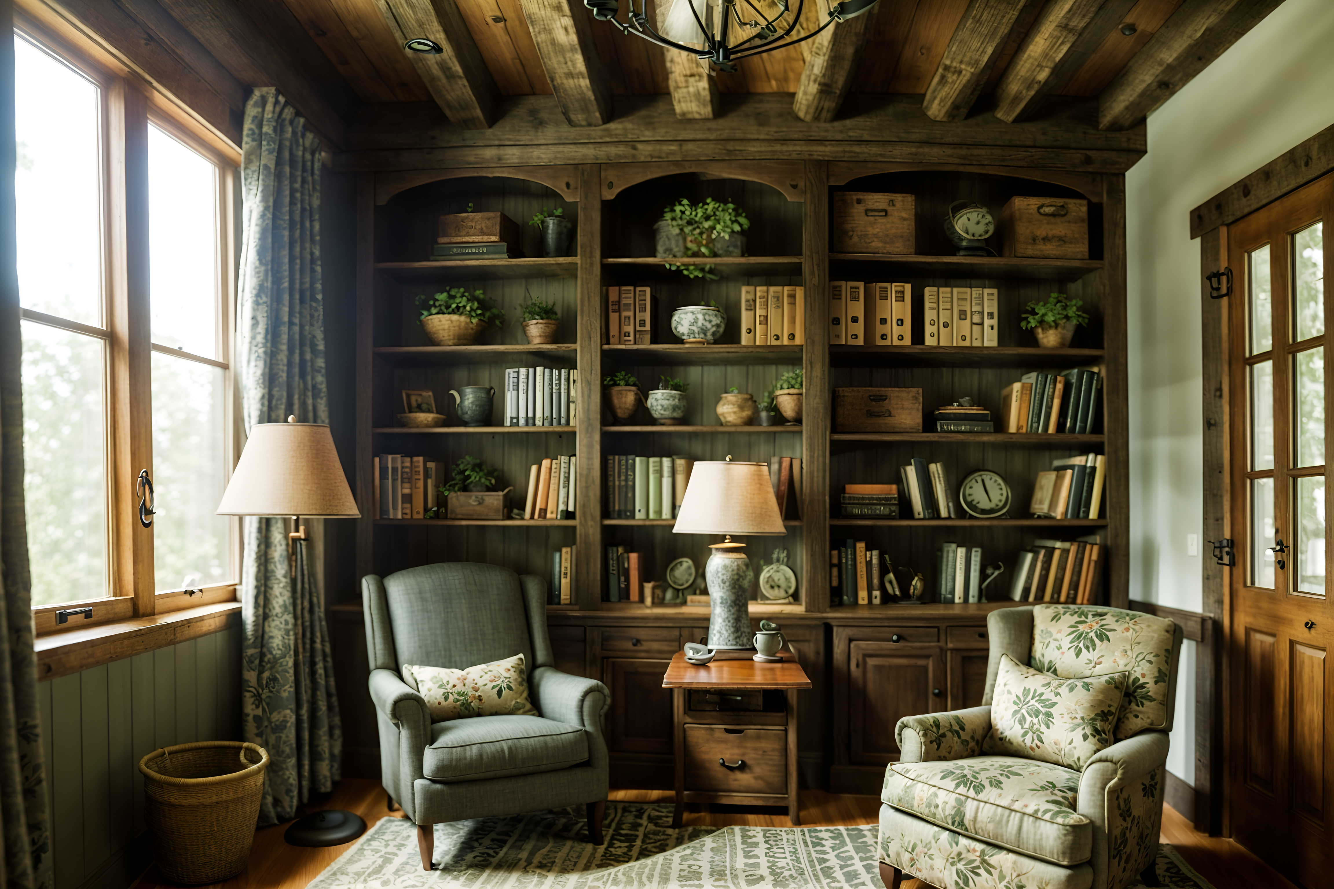 cottagecore study roomsinterior decorate this study room with cottagecore style. . . with writing desk and plant and cabinets and office chair and lounge chair and desk lamp and bookshelves and writing desk. . with muted colors and rustic and organic and traditional and natural and cottage style and floral patterns and earthy. . .
