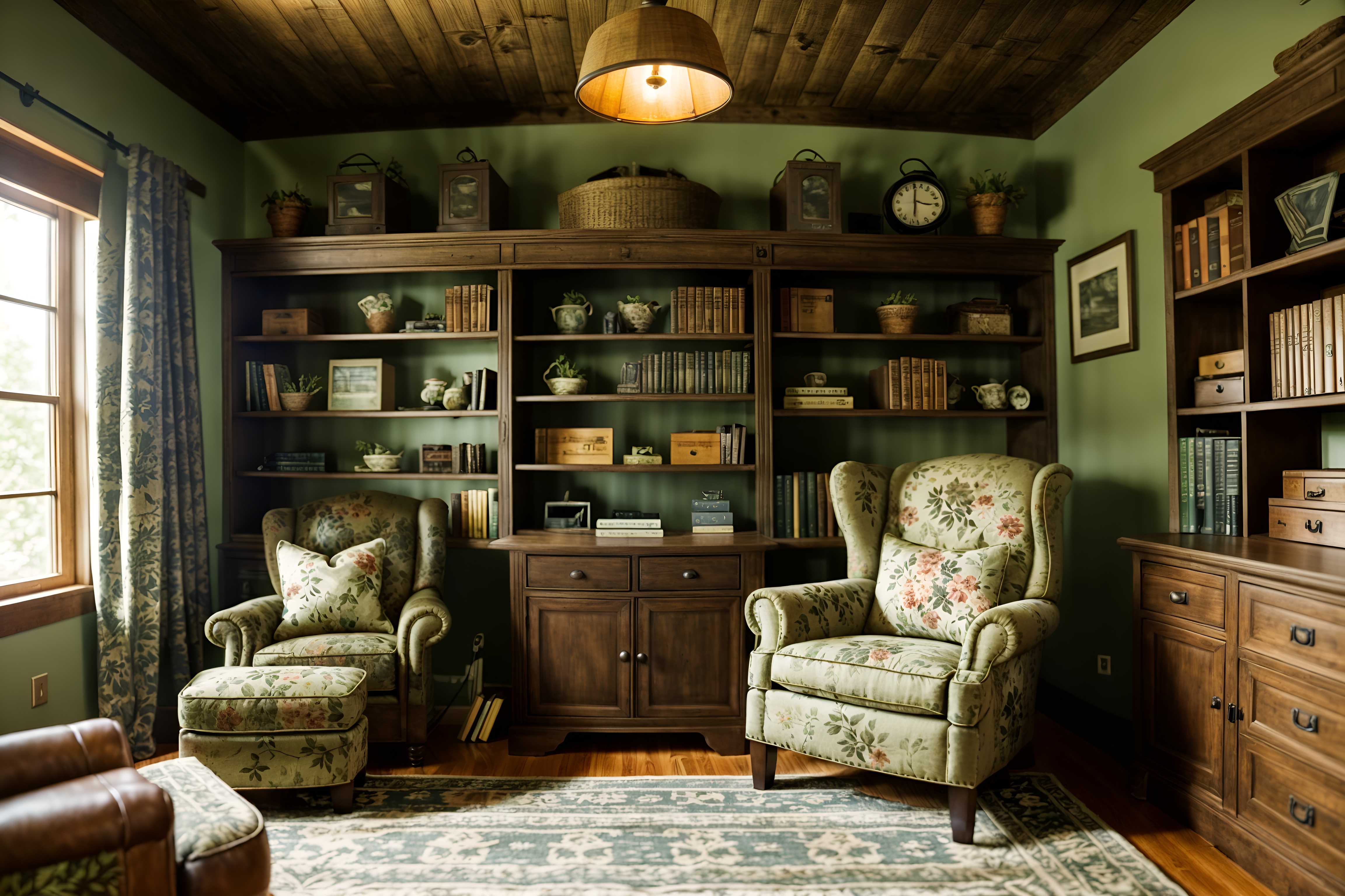 photo from pinterest of cottagecore-style interior designed (study room interior) with lounge chair and desk lamp and office chair and bookshelves and plant and cabinets and writing desk and lounge chair. . with organic and rustic and floral patterns and earthy and cottage style and country style and natural and muted colors. . cinematic photo, highly detailed, cinematic lighting, ultra-detailed, ultrarealistic, photorealism, 8k. trending on pinterest. cottagecore interior design style. masterpiece, cinematic light, ultrarealistic+, photorealistic+, 8k, raw photo, realistic, sharp focus on eyes, (symmetrical eyes), (intact eyes), hyperrealistic, highest quality, best quality, , highly detailed, masterpiece, best quality, extremely detailed 8k wallpaper, masterpiece, best quality, ultra-detailed, best shadow, detailed background, detailed face, detailed eyes, high contrast, best illumination, detailed face, dulux, caustic, dynamic angle, detailed glow. dramatic lighting. highly detailed, insanely detailed hair, symmetrical, intricate details, professionally retouched, 8k high definition. strong bokeh. award winning photo.