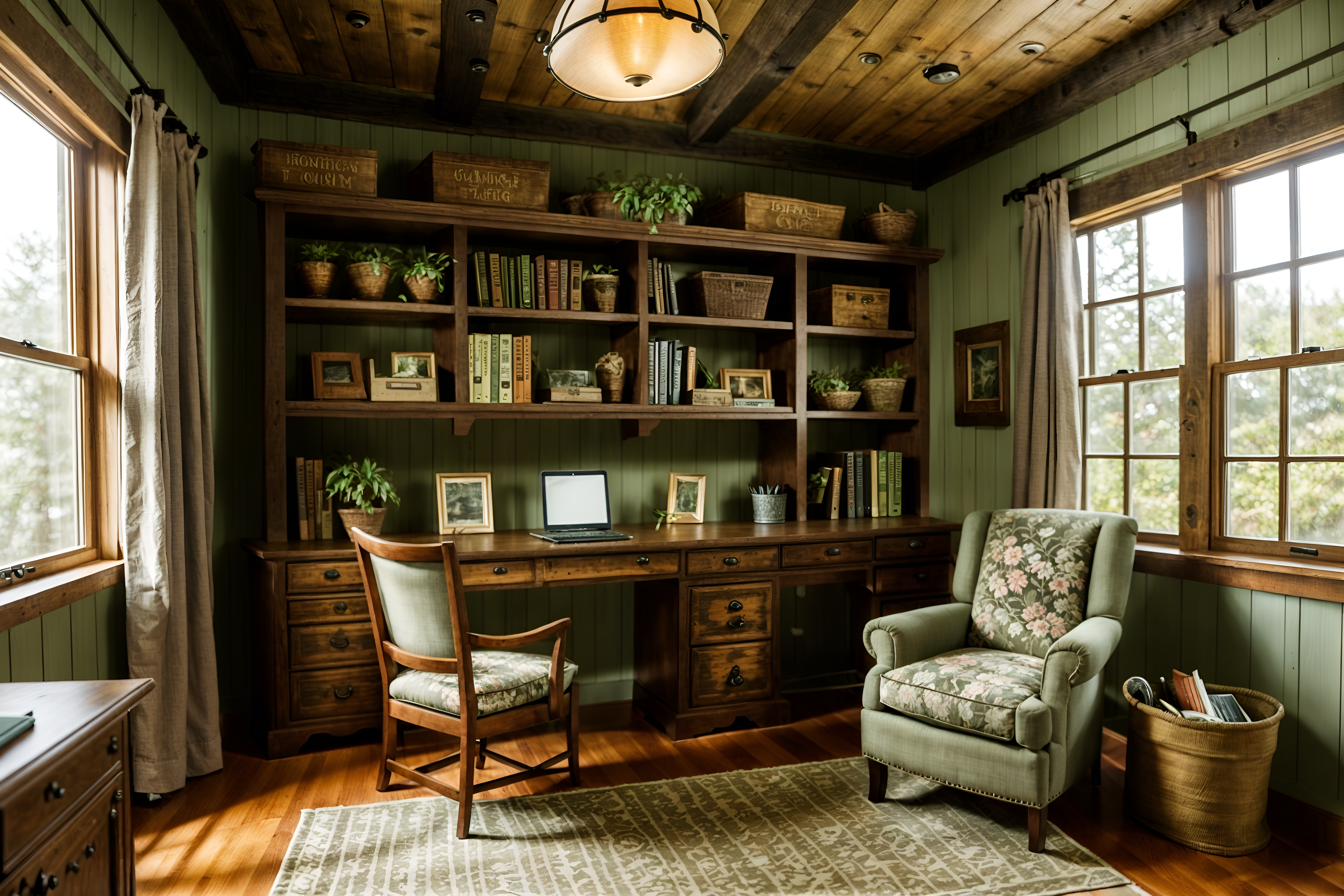photo from pinterest of cottagecore-style interior designed (study room interior) with lounge chair and desk lamp and office chair and bookshelves and plant and cabinets and writing desk and lounge chair. . with organic and rustic and floral patterns and earthy and cottage style and country style and natural and muted colors. . cinematic photo, highly detailed, cinematic lighting, ultra-detailed, ultrarealistic, photorealism, 8k. trending on pinterest. cottagecore interior design style. masterpiece, cinematic light, ultrarealistic+, photorealistic+, 8k, raw photo, realistic, sharp focus on eyes, (symmetrical eyes), (intact eyes), hyperrealistic, highest quality, best quality, , highly detailed, masterpiece, best quality, extremely detailed 8k wallpaper, masterpiece, best quality, ultra-detailed, best shadow, detailed background, detailed face, detailed eyes, high contrast, best illumination, detailed face, dulux, caustic, dynamic angle, detailed glow. dramatic lighting. highly detailed, insanely detailed hair, symmetrical, intricate details, professionally retouched, 8k high definition. strong bokeh. award winning photo.