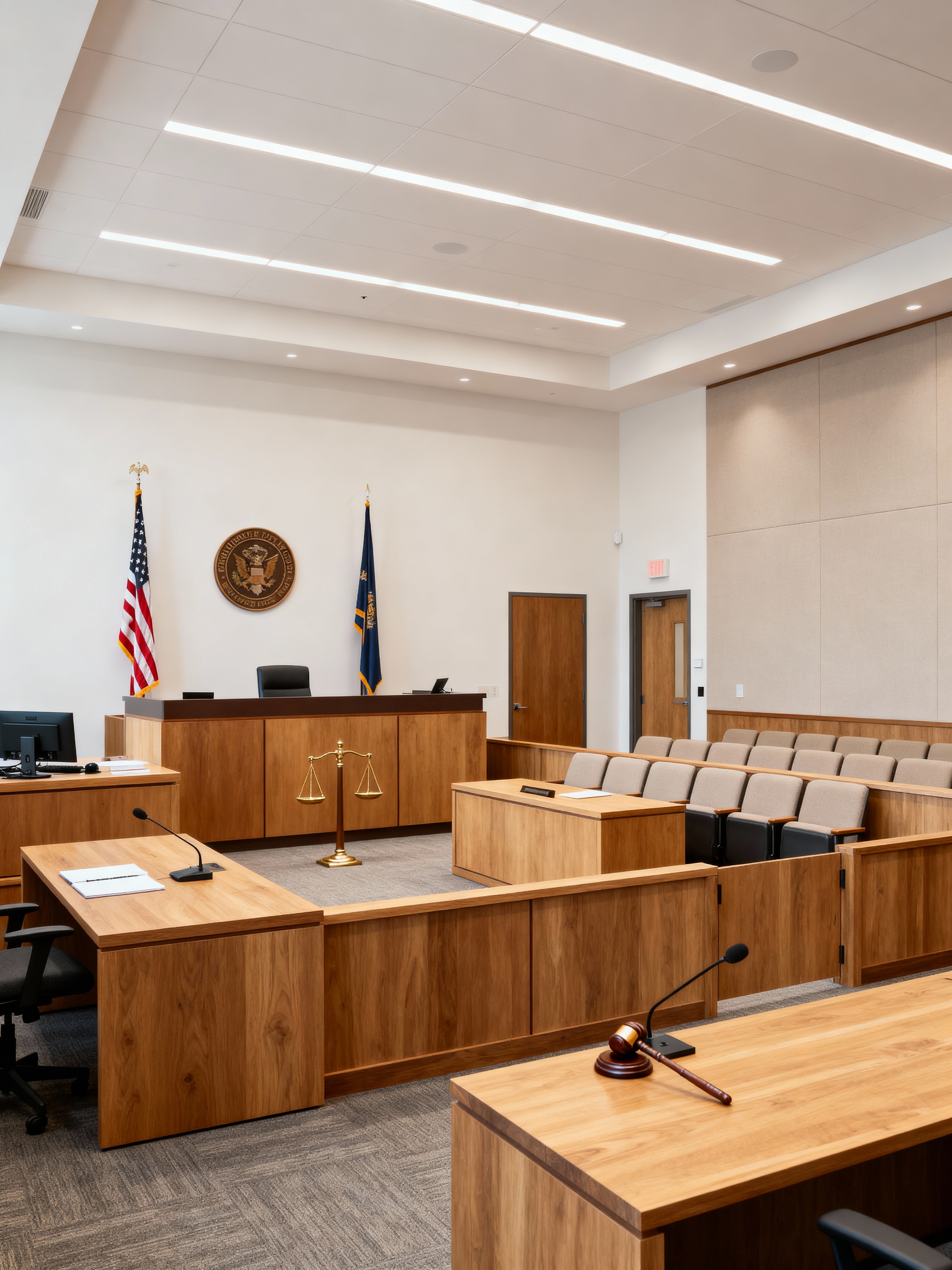 courtroom with airbnb style with court reporter desk and flags and gallery seating and jury box and gavel and scales of justice and witness stand and attorney tables. . with open and natural lighting and simple color palette and simple, clean lines and simplistic furniture and scandinavian style and natural materials and elements and practicality and functionality and neutral walls and textures and open and natural lighting