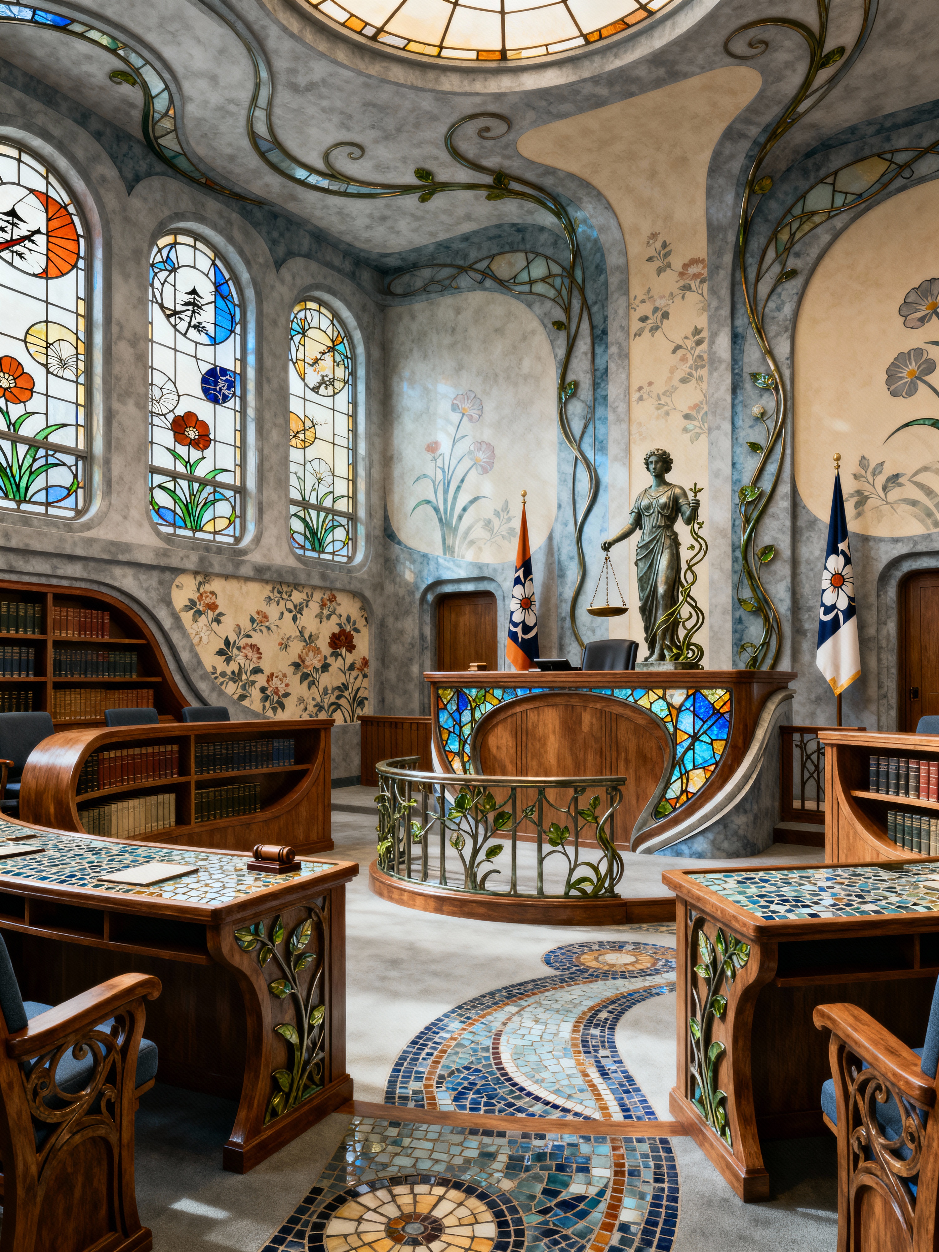 courtroom with art nouveau style with gallery seating and attorney tables and legal books and witness stand and judge bench and scales of justice and flags and jury box. . with asymmetrical shapes and mosaics and stained glass and stained glass and japanese motifs and curving, plant-like embellishments and ashy colors and wallpaper patterns of stylized flowers