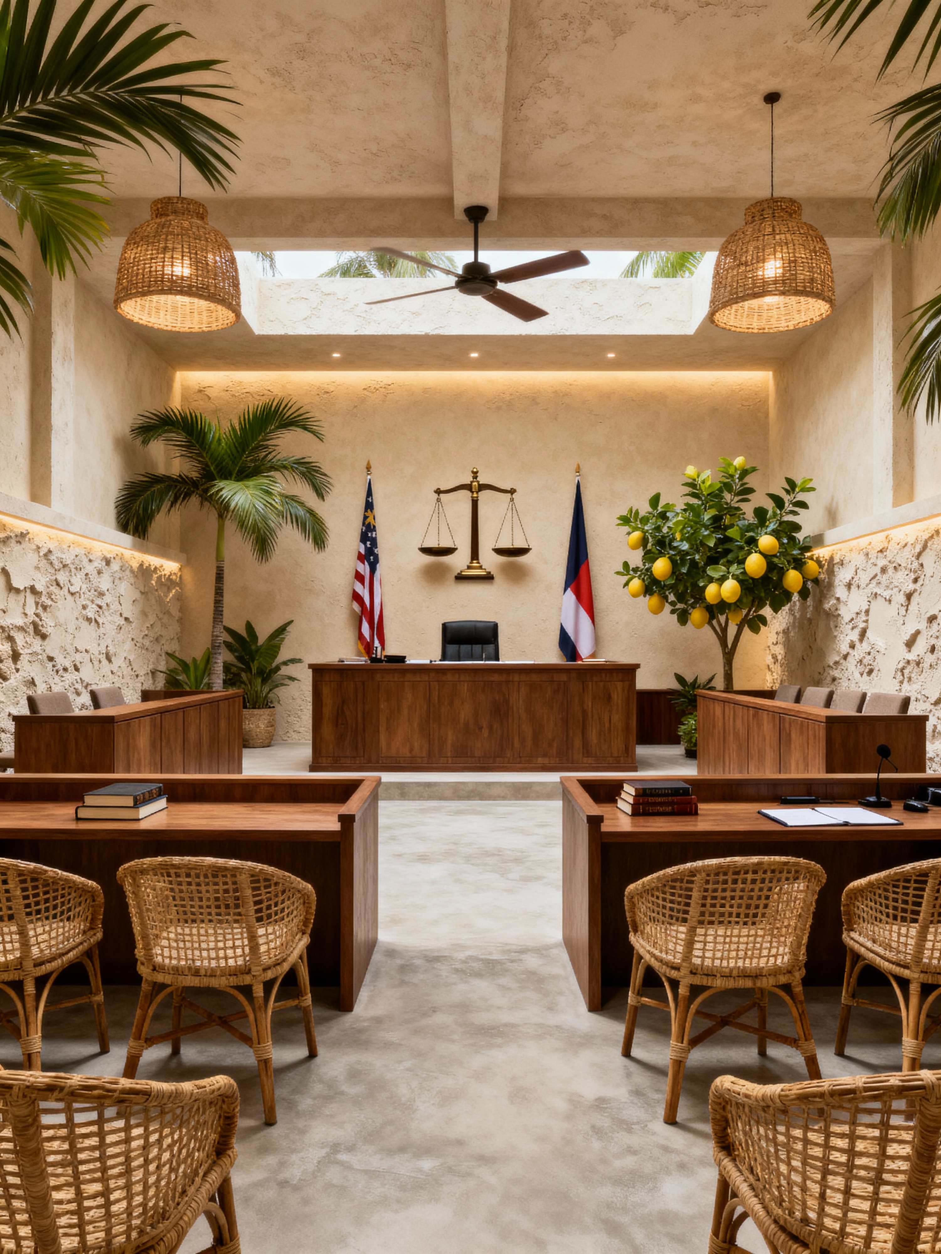 courtroom with bali style with scales of justice and flags and jury box and court reporter desk and gallery seating and legal books and judge bench and witness stand. . with neutral color palette and warm ambient lighting and microcement floors and lush tropical plants (palms, lemon trees) and open high ceilings with fans and rattan chairs and decor and textured plaster or stucco finish and woven pendant lamps