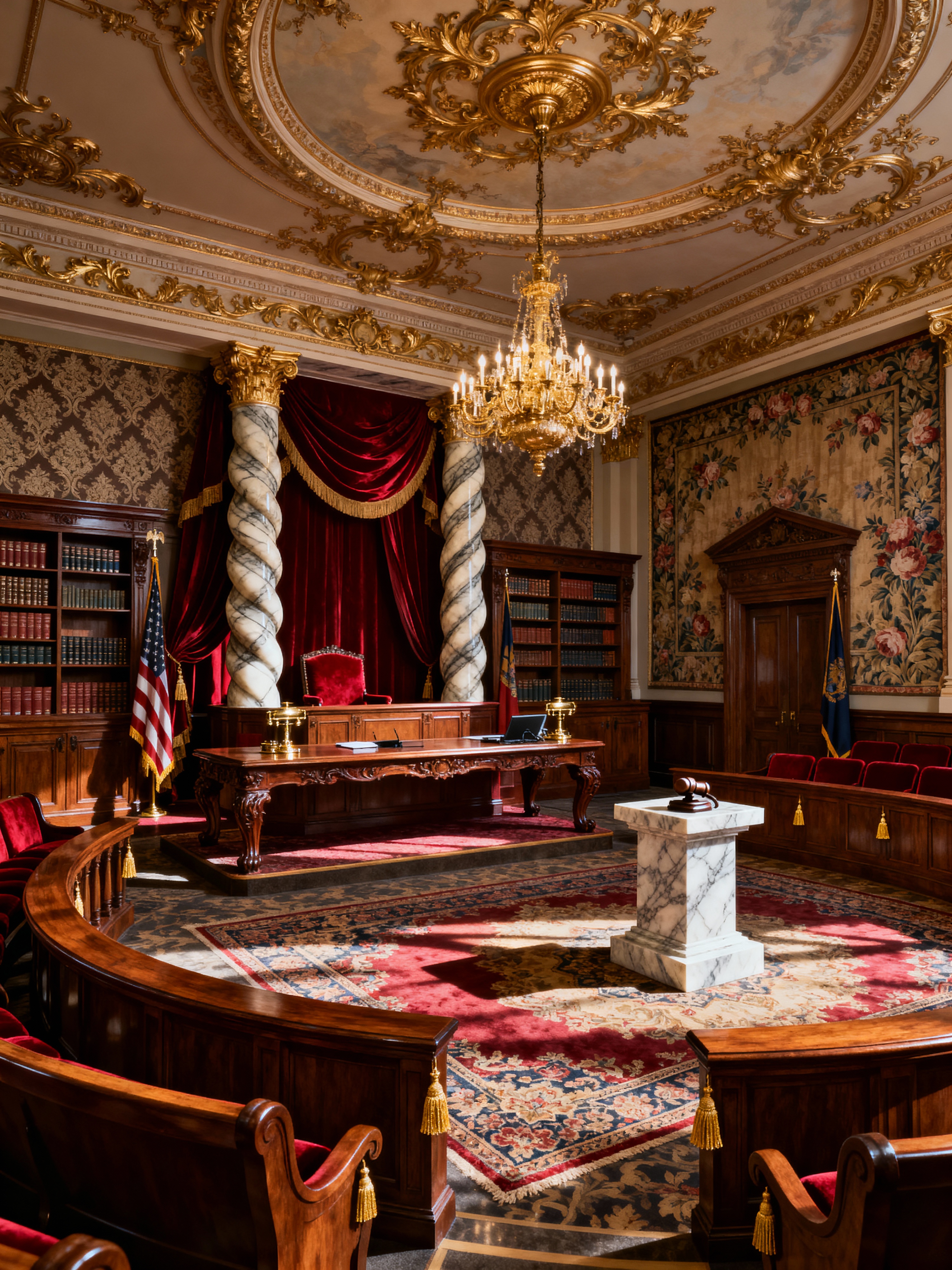 courtroom with baroque style with flags and attorney tables and jury box and court reporter desk and legal books and witness stand and gavel and gallery seating. . with dynamism and movement and luxurious floral and damask fabrics and expensive and plush flooring and elaborate ornamentation and grandeur and tension and twisted columns